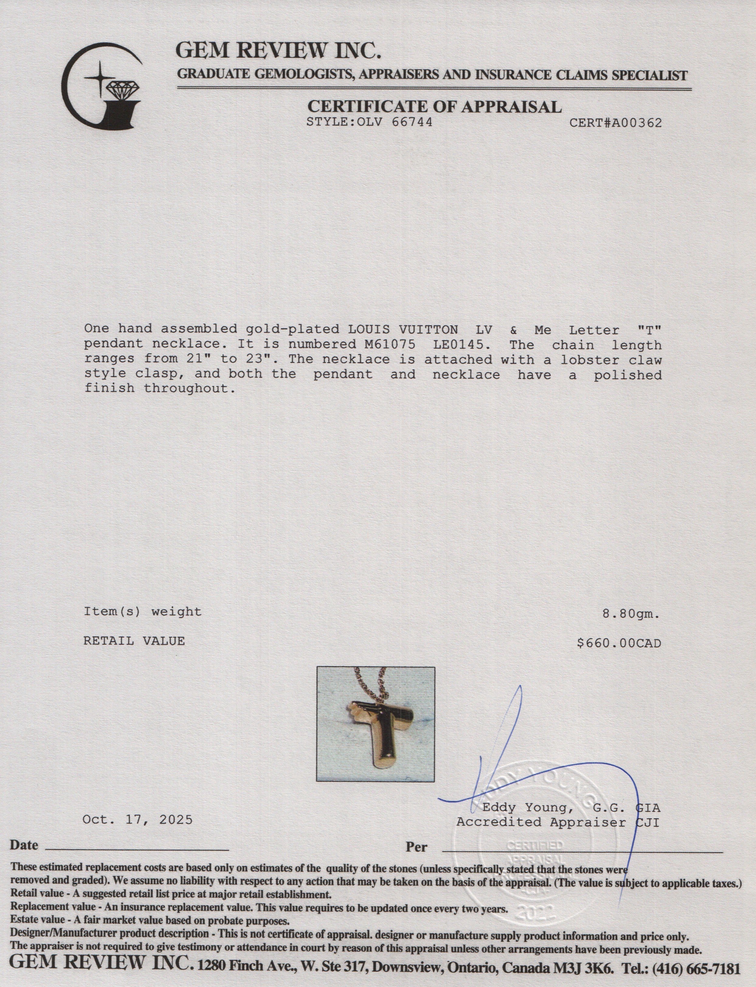 Gold Plated LV & Me Letter 'T' Pendant Necklace w/ Box