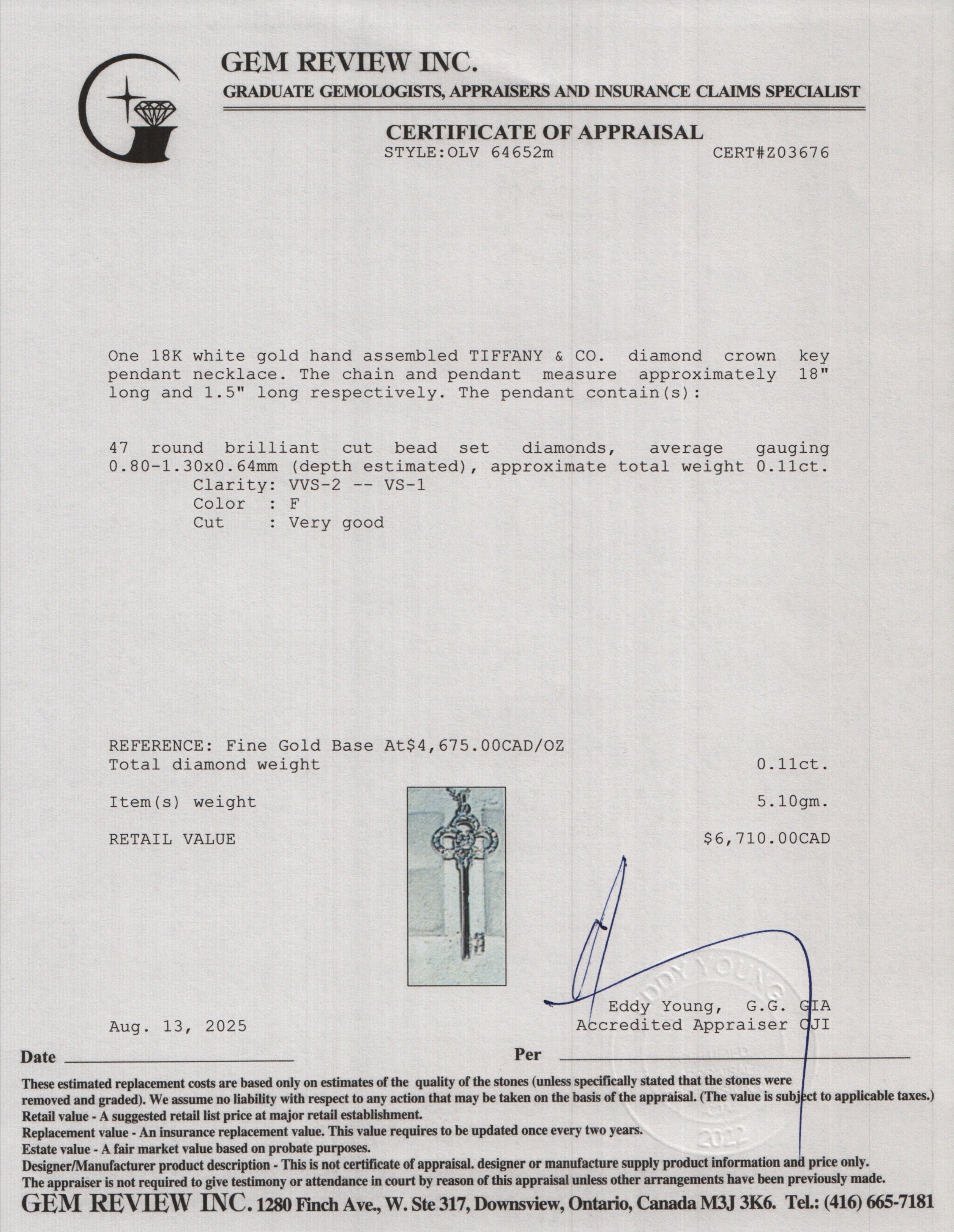 18k White Gold Diamond 1.5" Crown Key Pendant Necklace w/ Box
