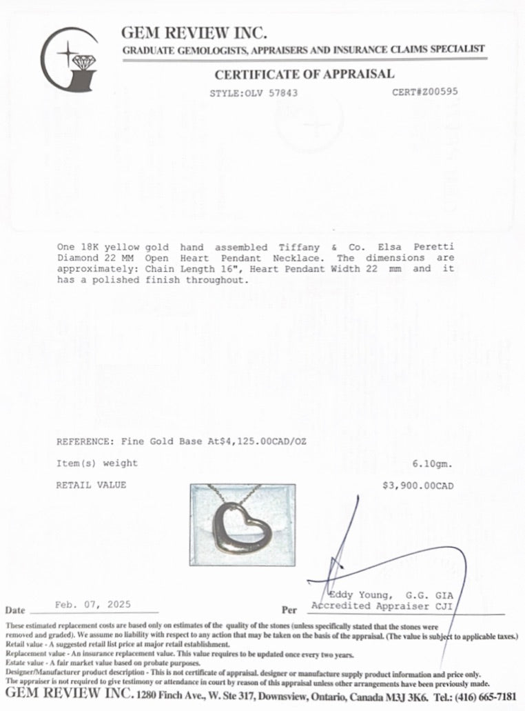 Elsa Peretti 18k Yellow Gold Diamond 22 MM Open Heart Pendant Necklace w/ Box