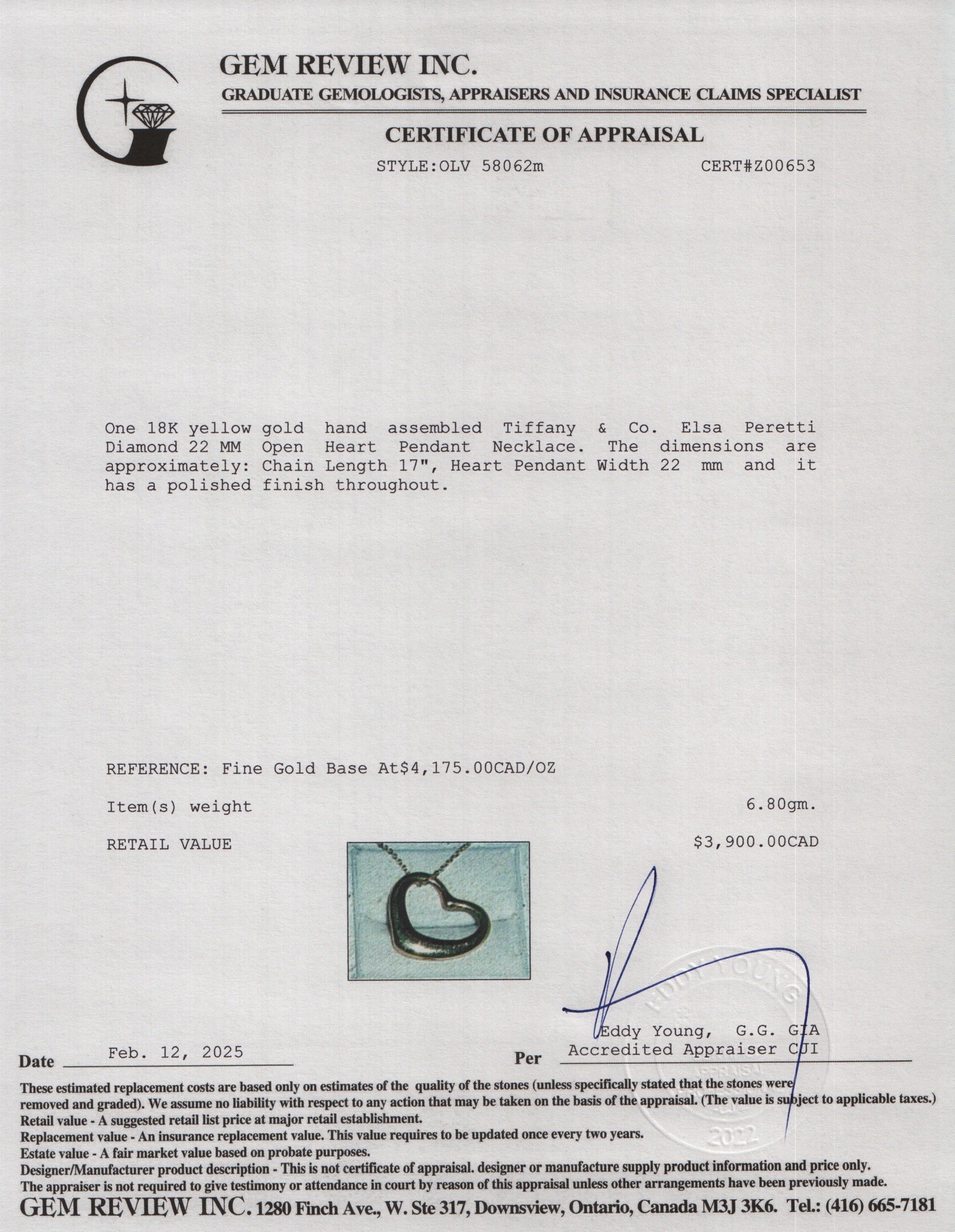 Elsa Peretti 18k Yellow Gold Diamond 22 MM Open Heart Pendant Necklace w/ Box