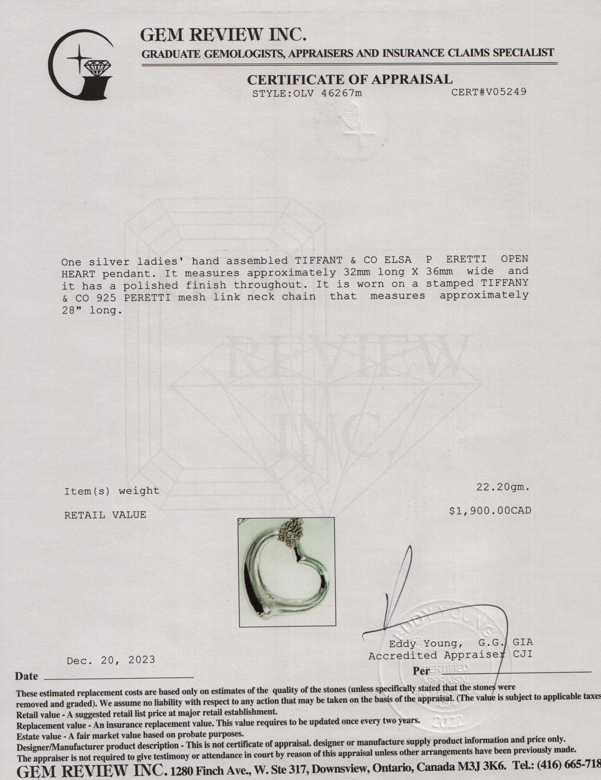 Elsa Peretti Sterling Silver Large 36 MM Open Heart Pendant Mesh Necklace