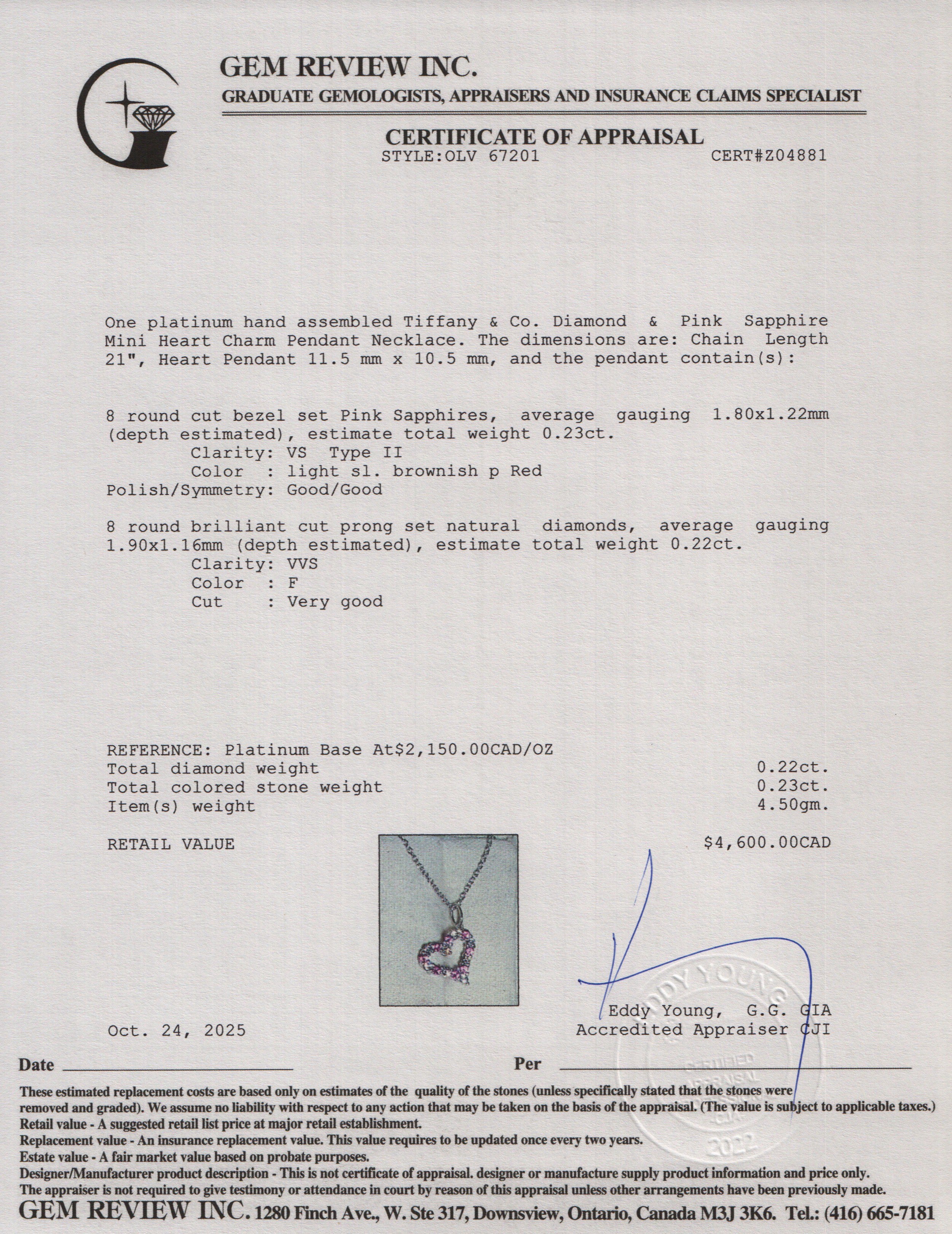 Platinum Diamond & Pink Sapphire Mini Heart Charm Pendant Necklace w/ Box