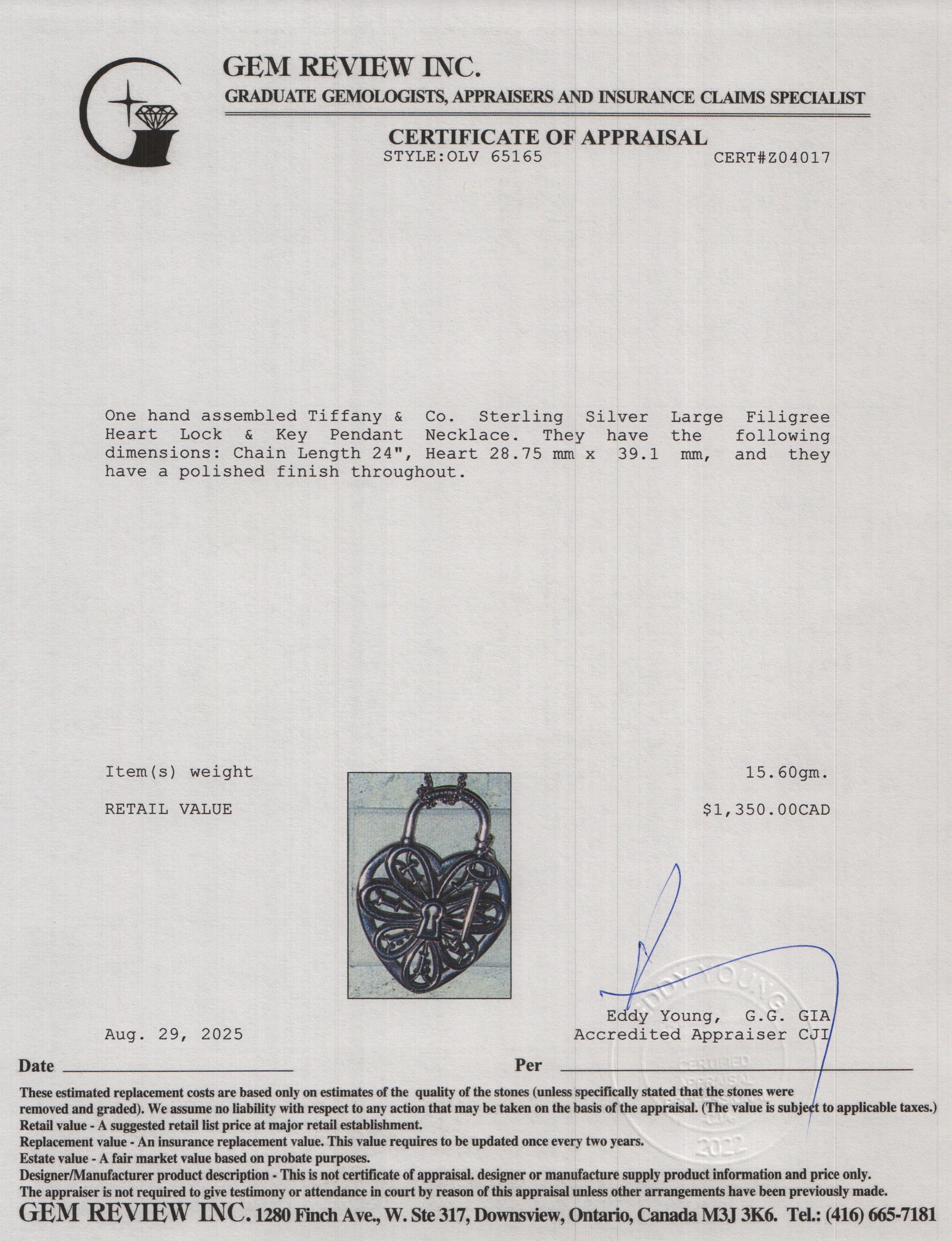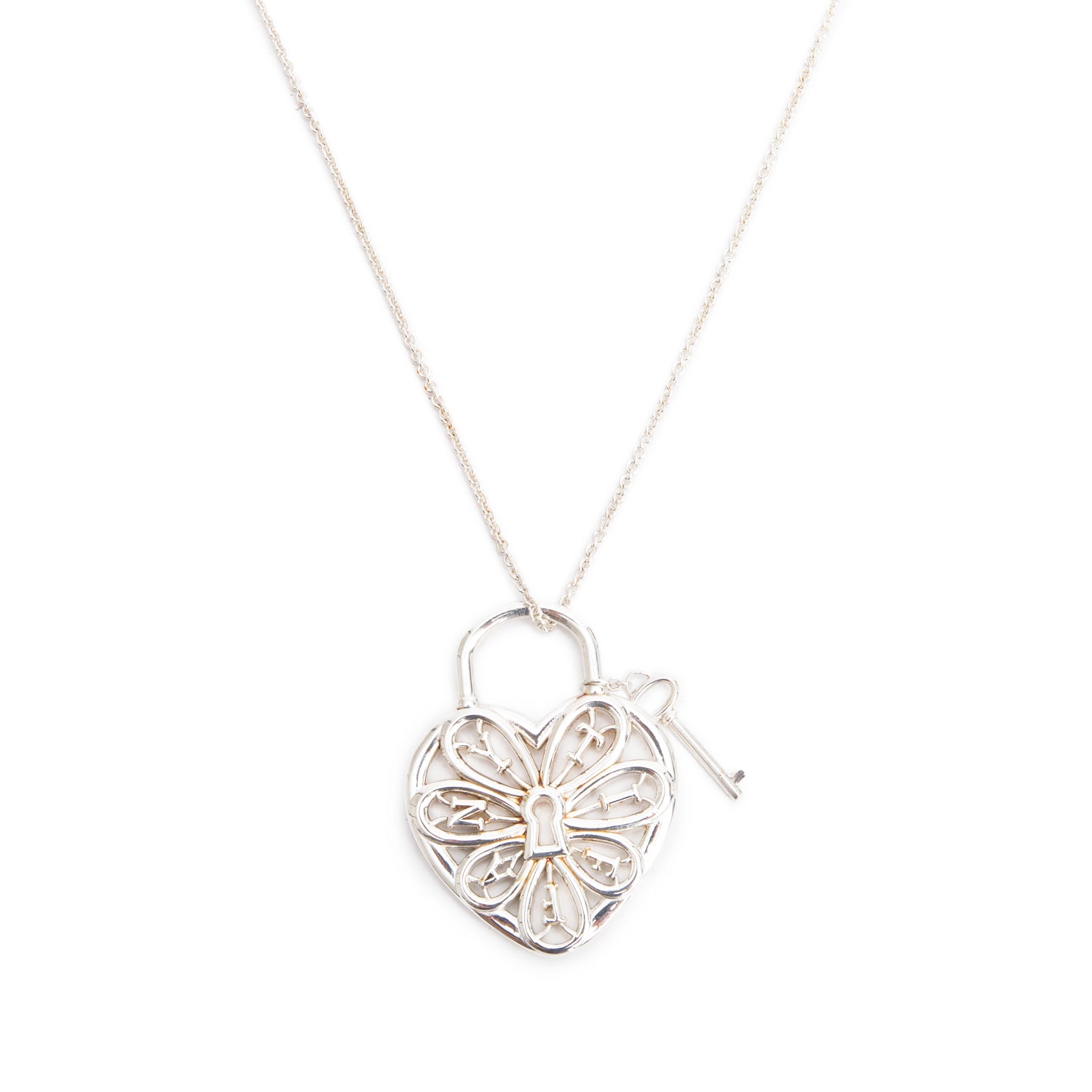 Sterling Silver Large Filigree Heart Lock & Key Pendant Necklace