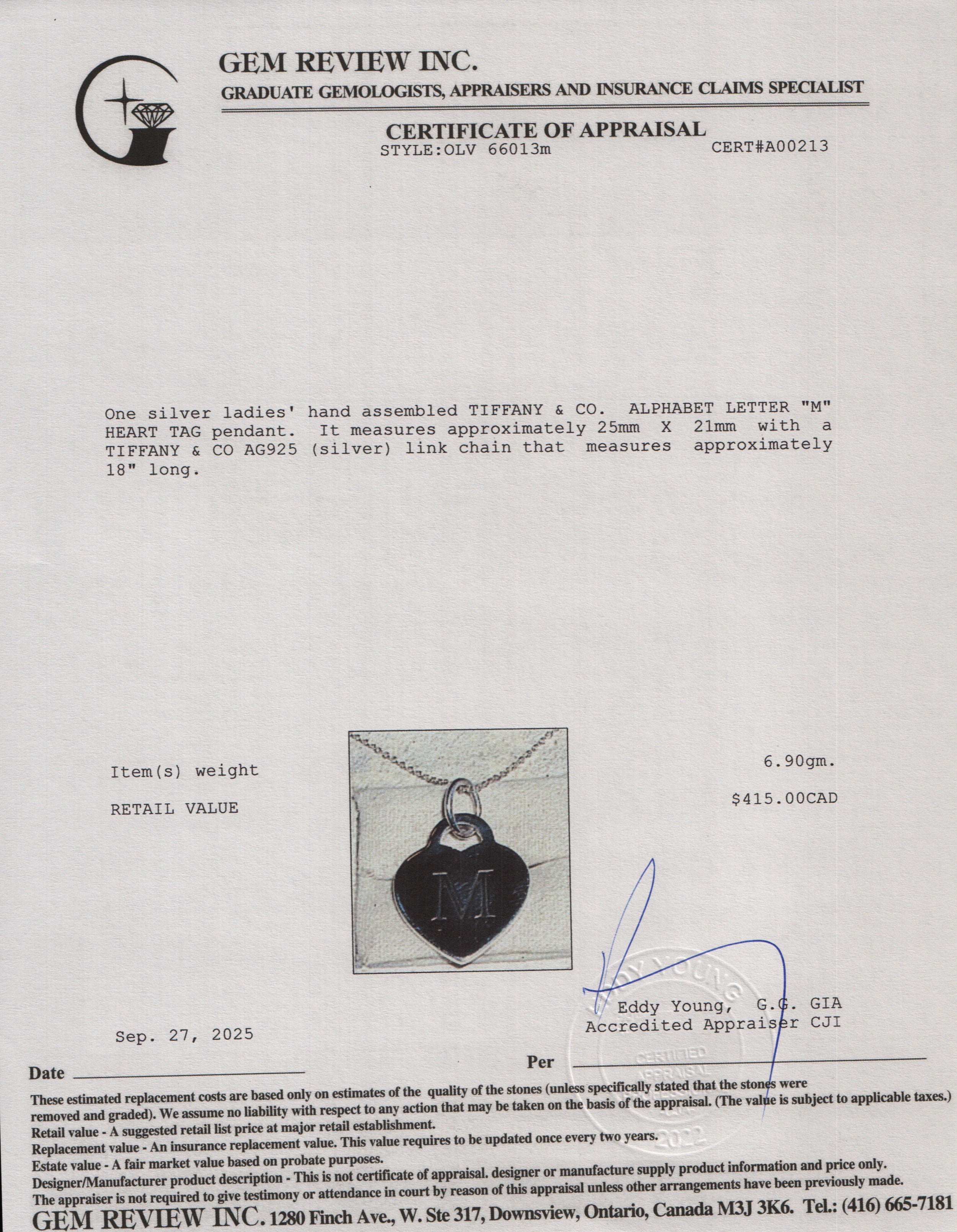 Sterling Silver Letter 'M' Medium Heart Tag Pendant Necklace