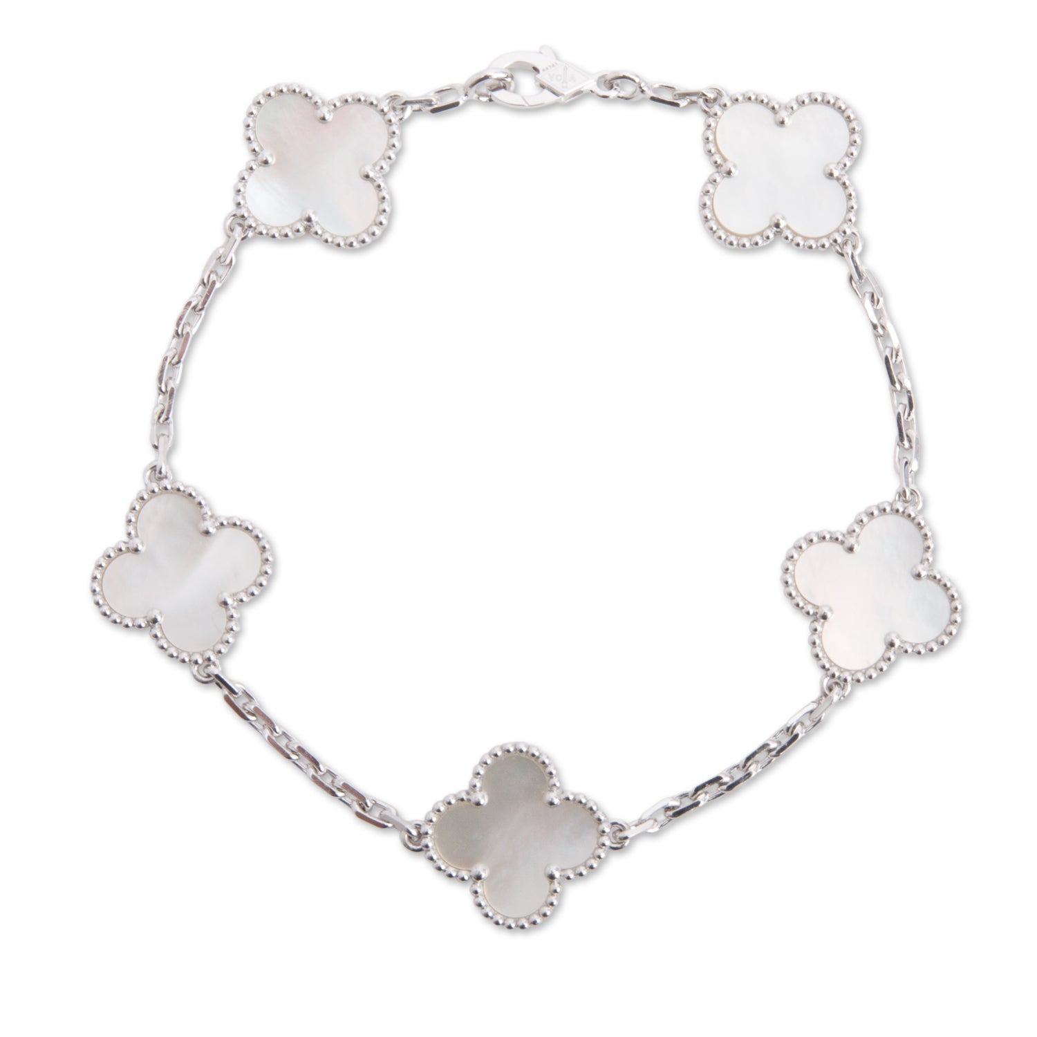 2022 18k White Gold Vintage Alhambra 5 Motif Mother of Pearl Bracelet w/ Box, Receipt & Certificate