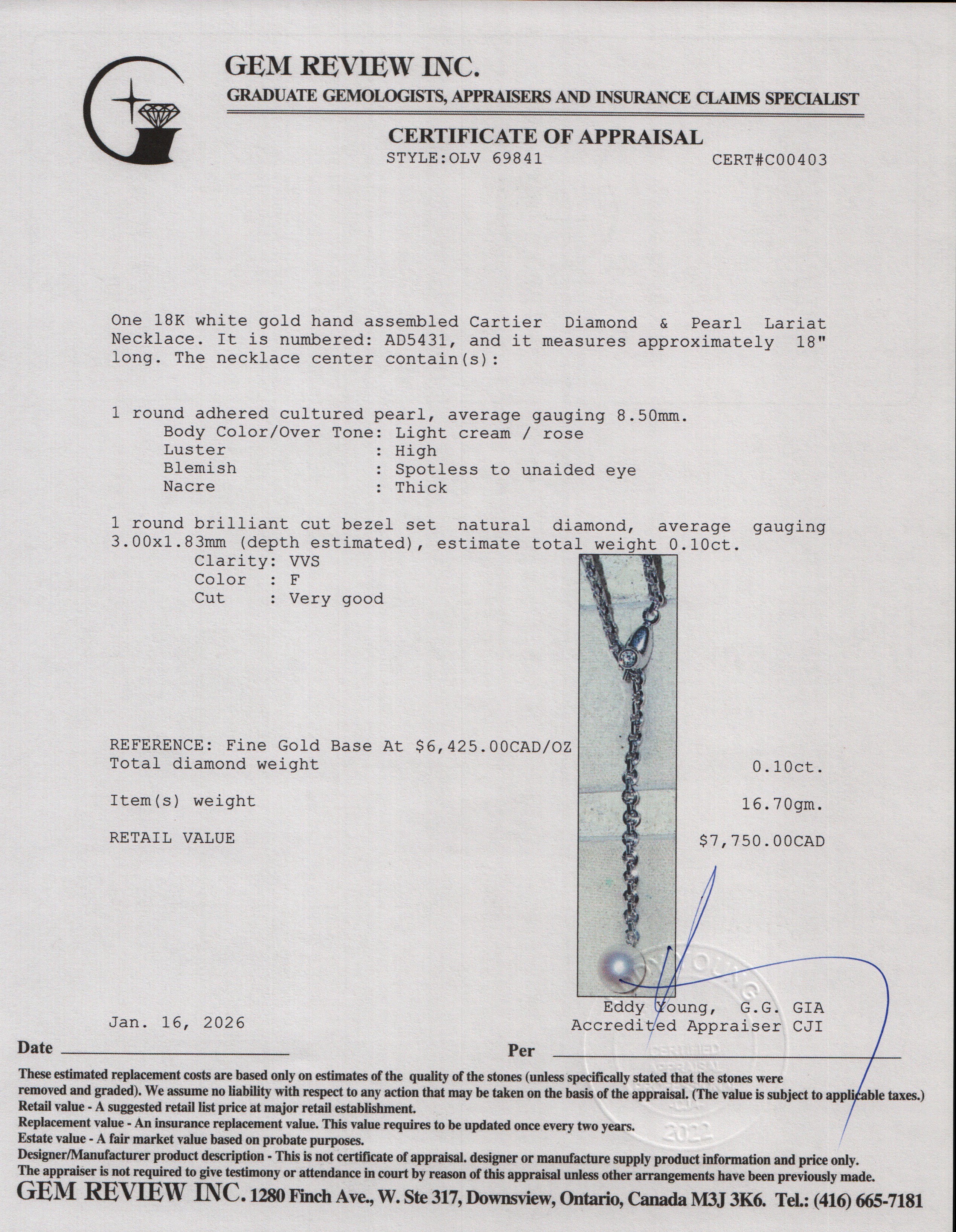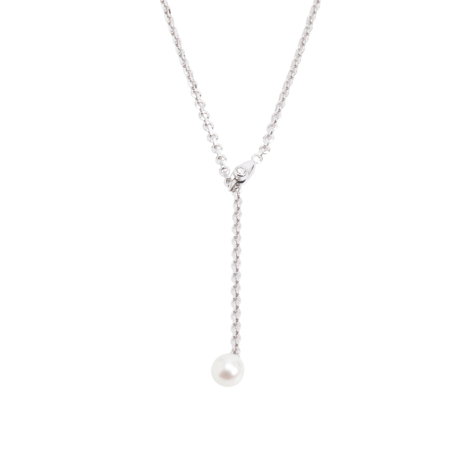Vintage 18k White Gold Diamond & Pearl Lariat Necklace