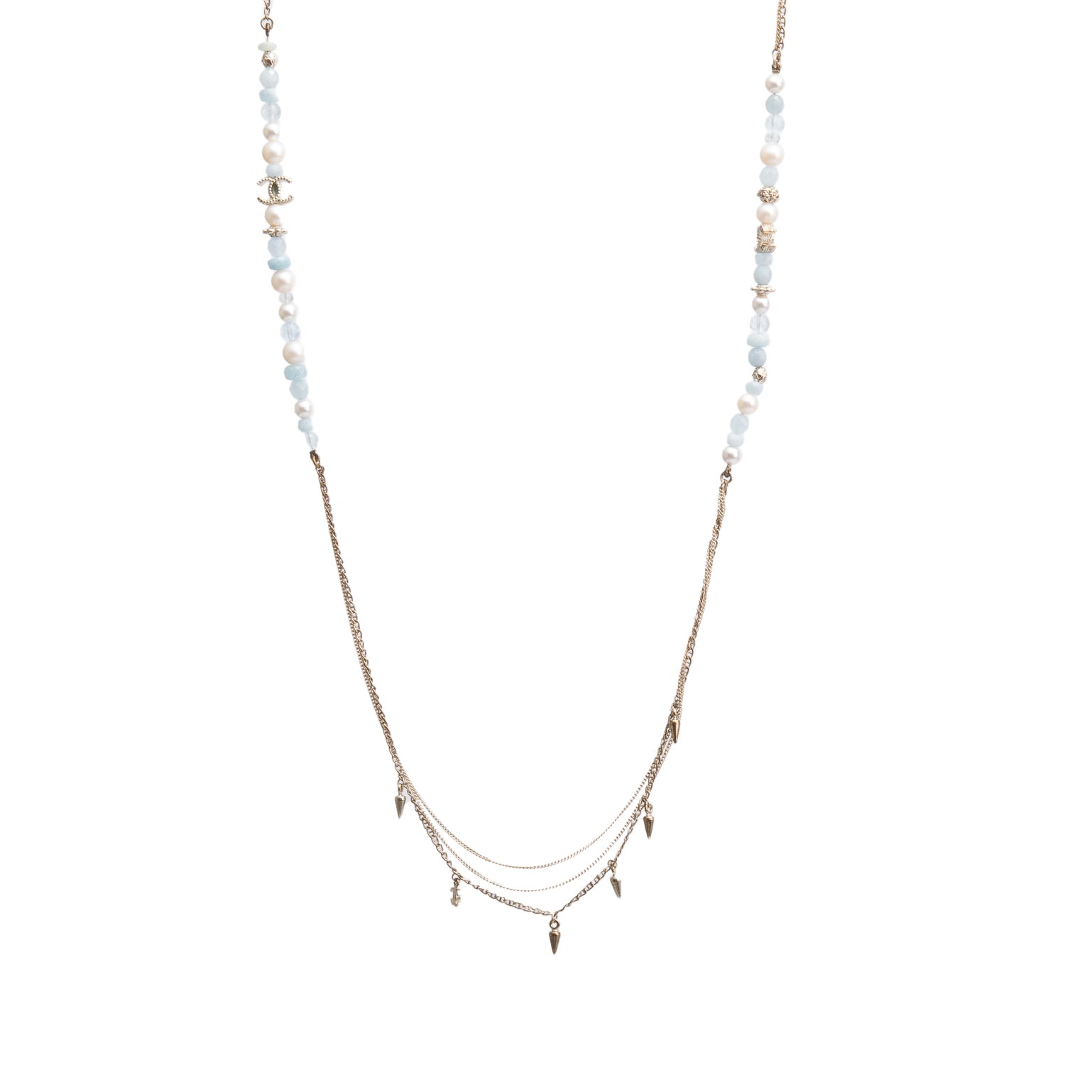 Gold-Plated Aquamarine & Quartz Bead, Faux Pearl & CC Station Necklace