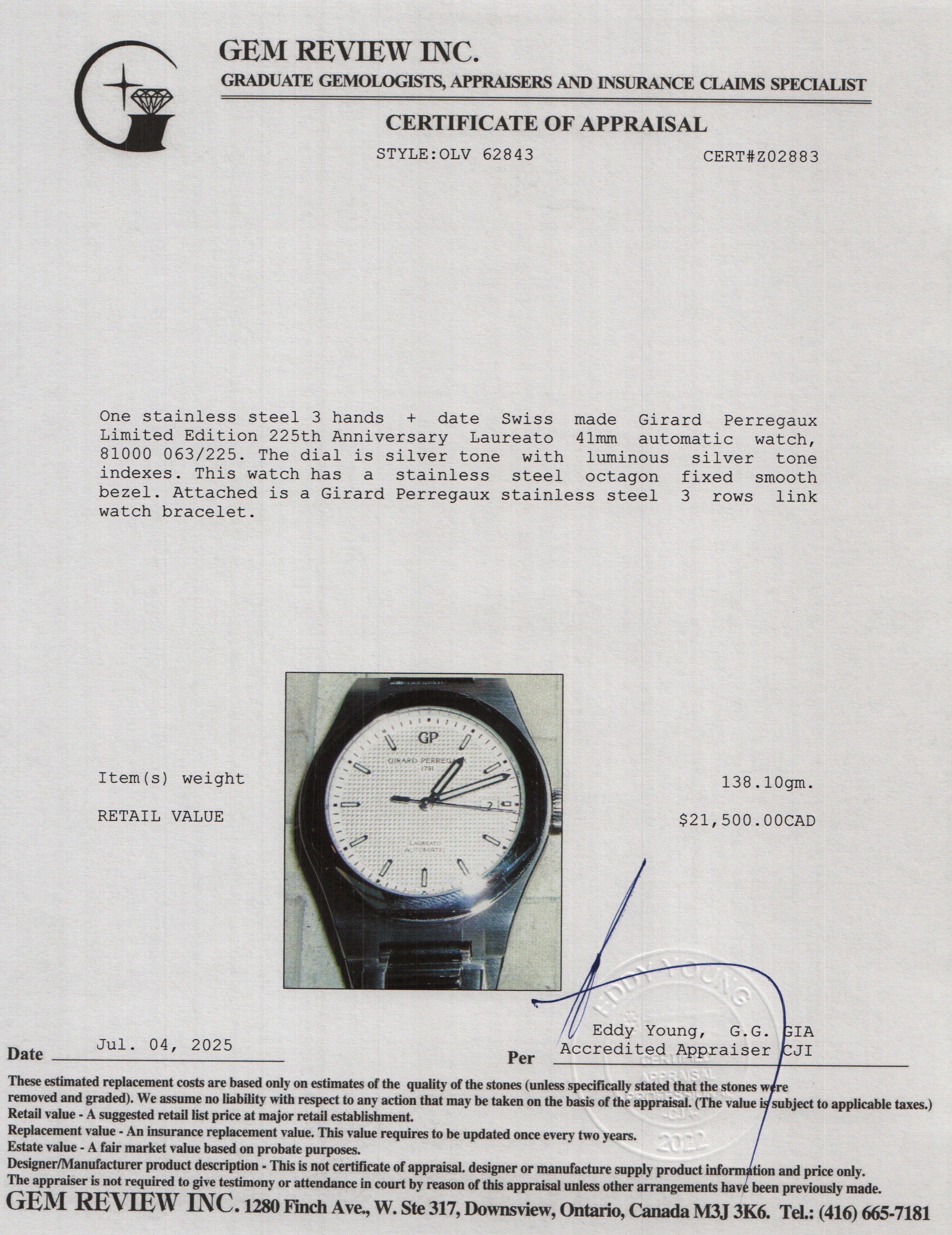 Limited Edition 225th Anniversary Stainless Steel Laureato 41 MM Automatic Watch Silver Dial 81000 w/ Box & Papers