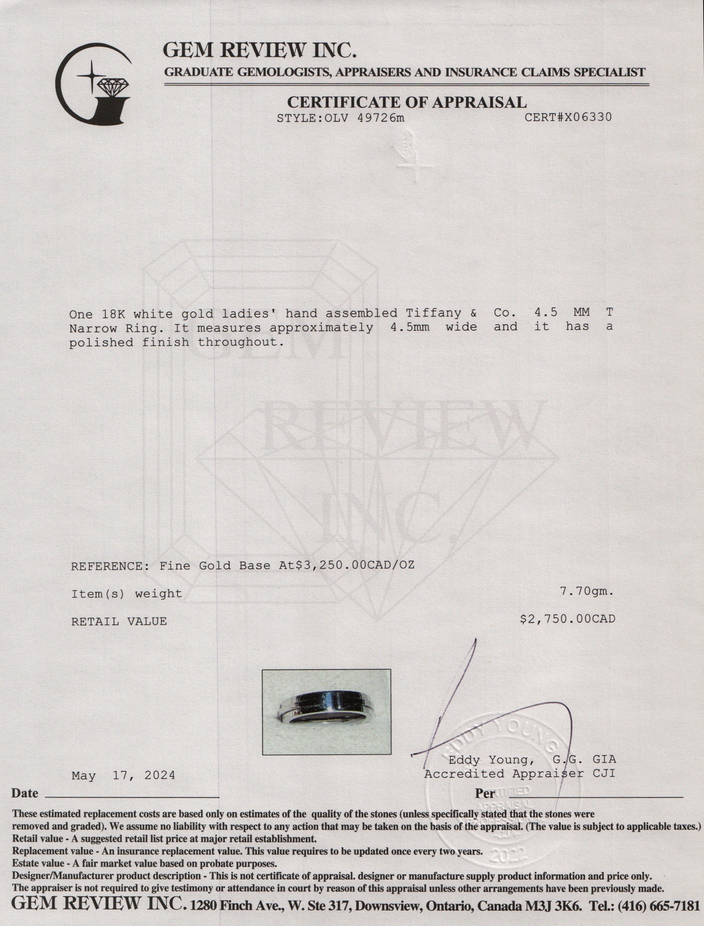 18k White Gold 4.5 MM T Narrow Ring, Size 6 w/ Box & Receipt