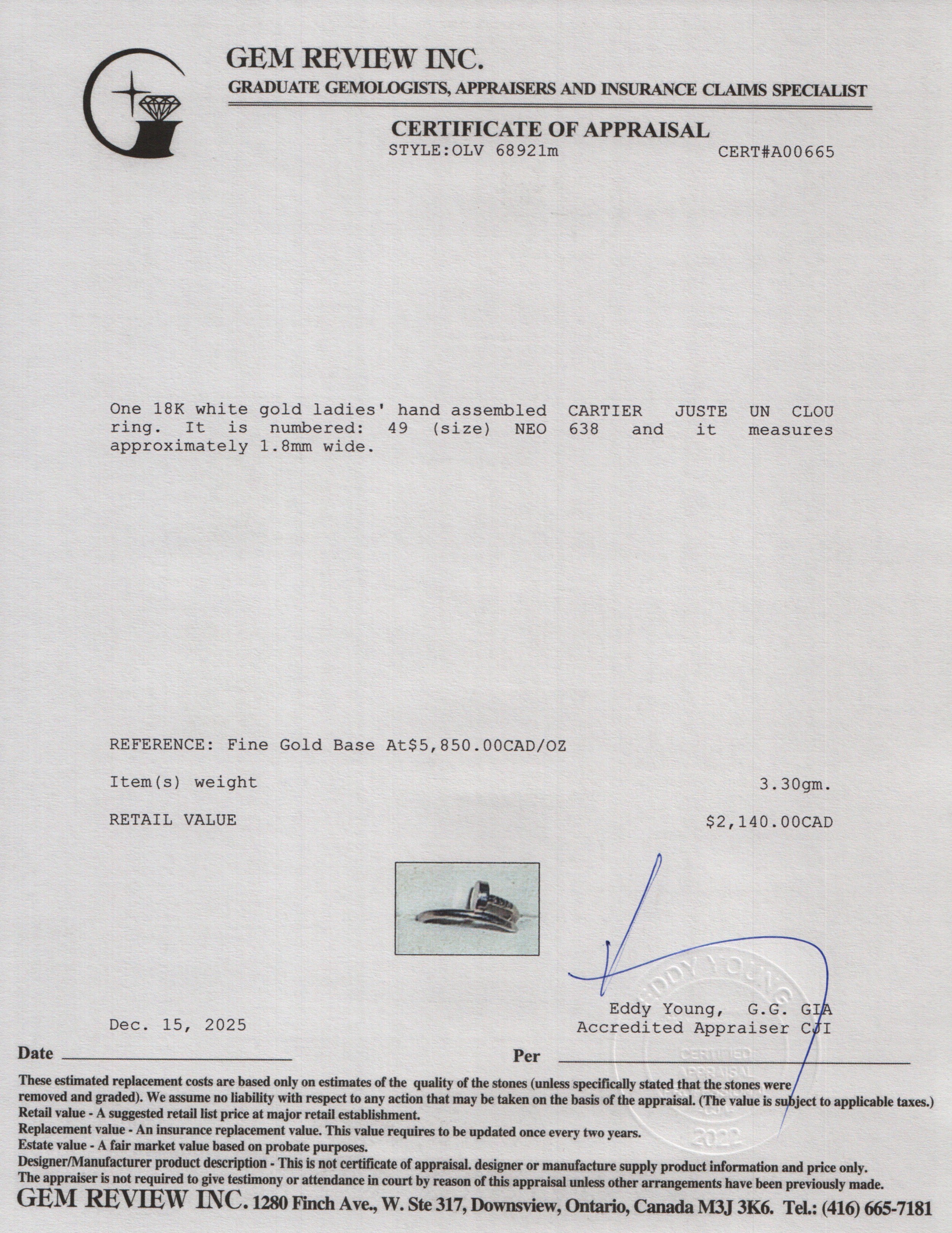 18k White Gold Juste Un Clou Ring, Small Model, Size 49 4.75 w/ Box