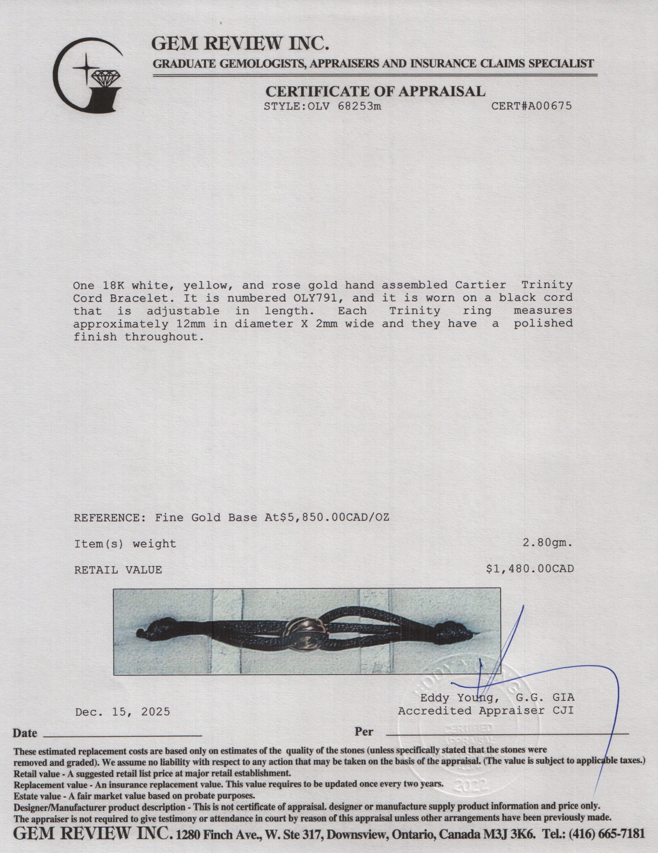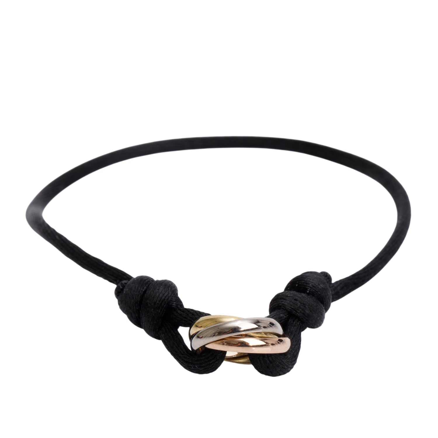 18k White, Yellow & Rose Gold Trinity Black Cord Bracelet w/ Box