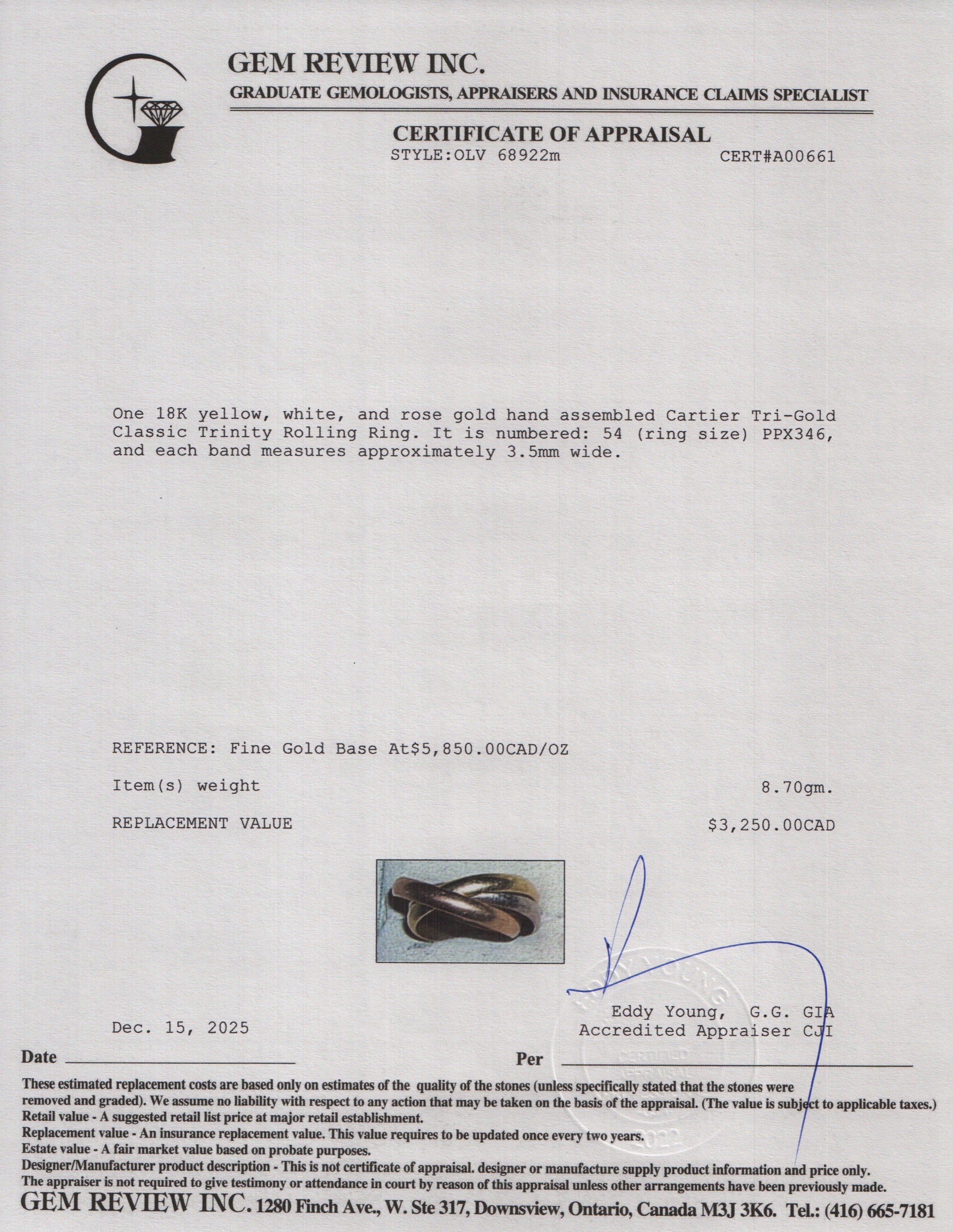2022 18k Tri-Gold Classic Trinity Rolling Ring, Size 54 7 w/ Box, Receipt & Certificate