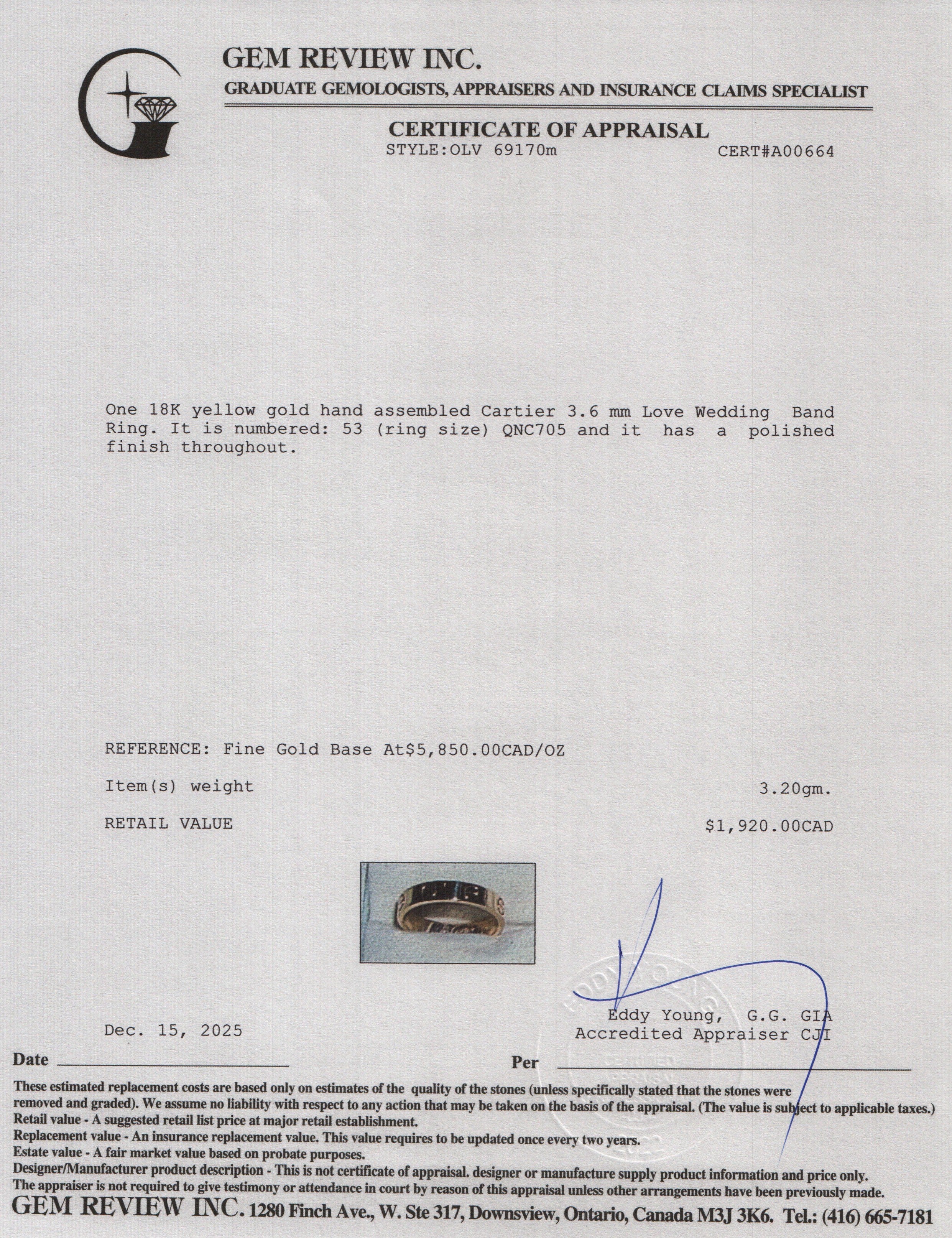 2023 18k Rose Gold 3.6 mm Love Wedding Band Ring, Size 53 6.5 w/ Box & Receipt