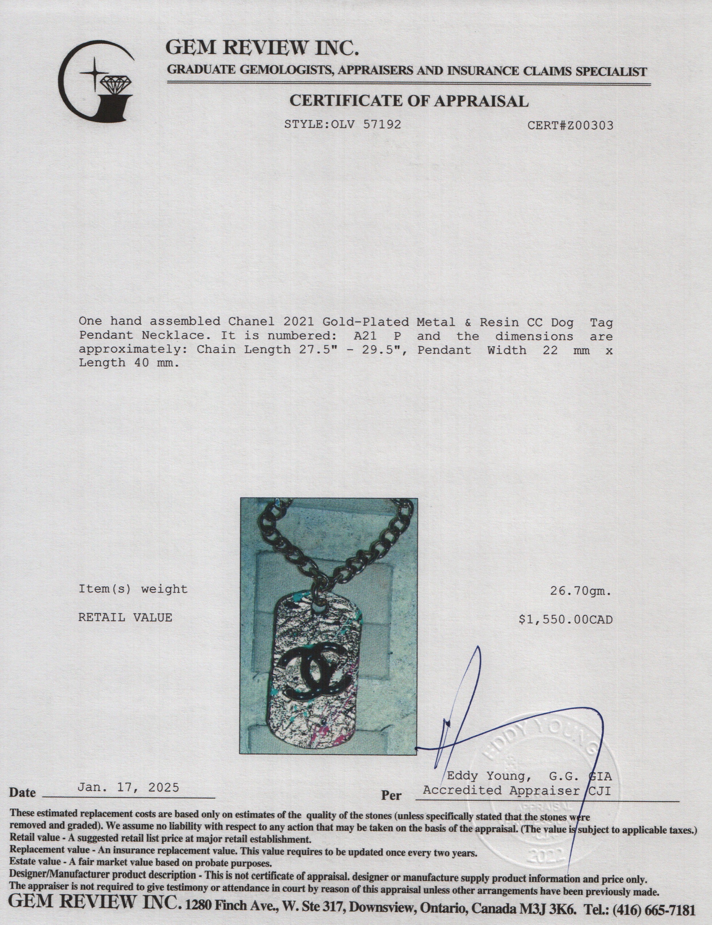 2021 Gold-Plated Metal & Resin CC Dog Tag Pendant Necklace w/ Box