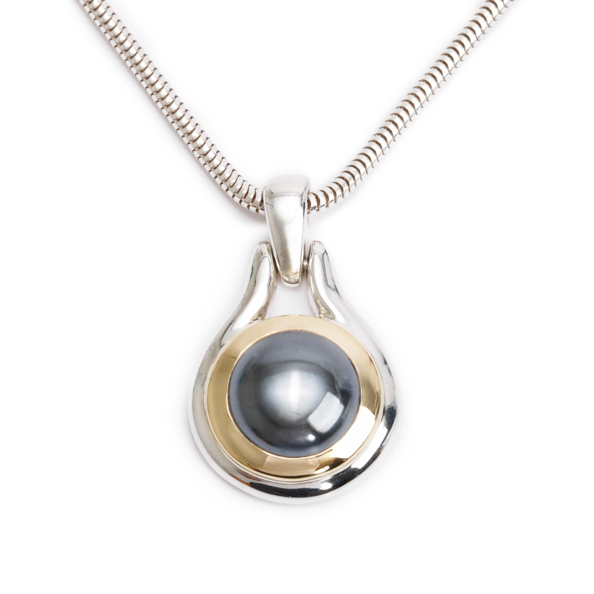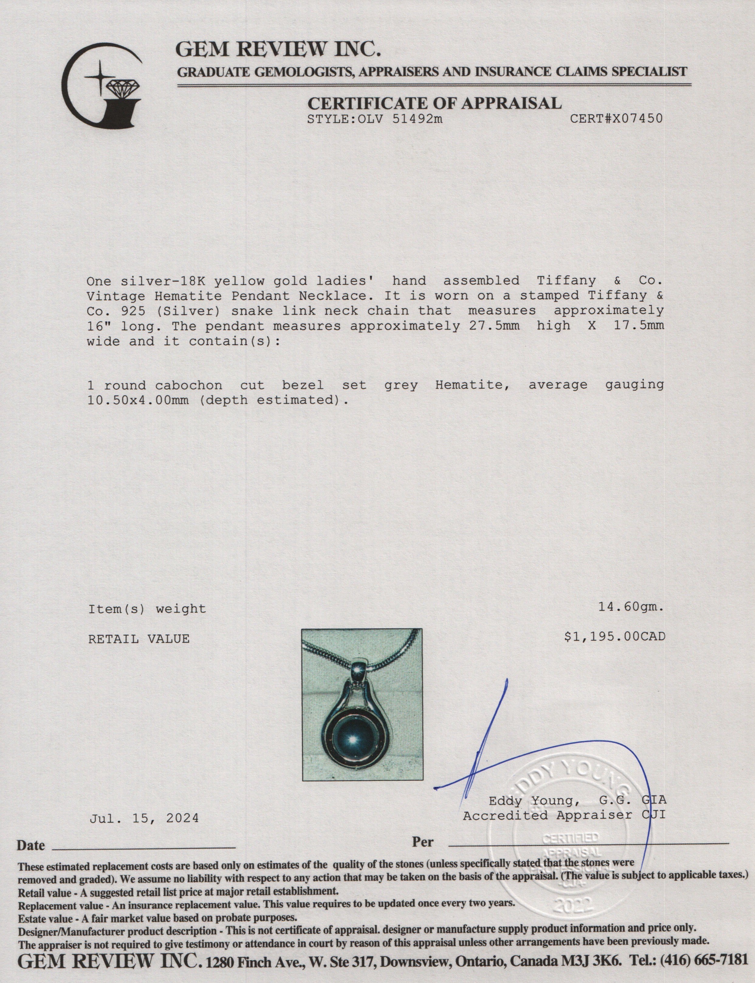 Vintage Sterling Silver & 18k Yellow Gold Hematite Pendant Necklace