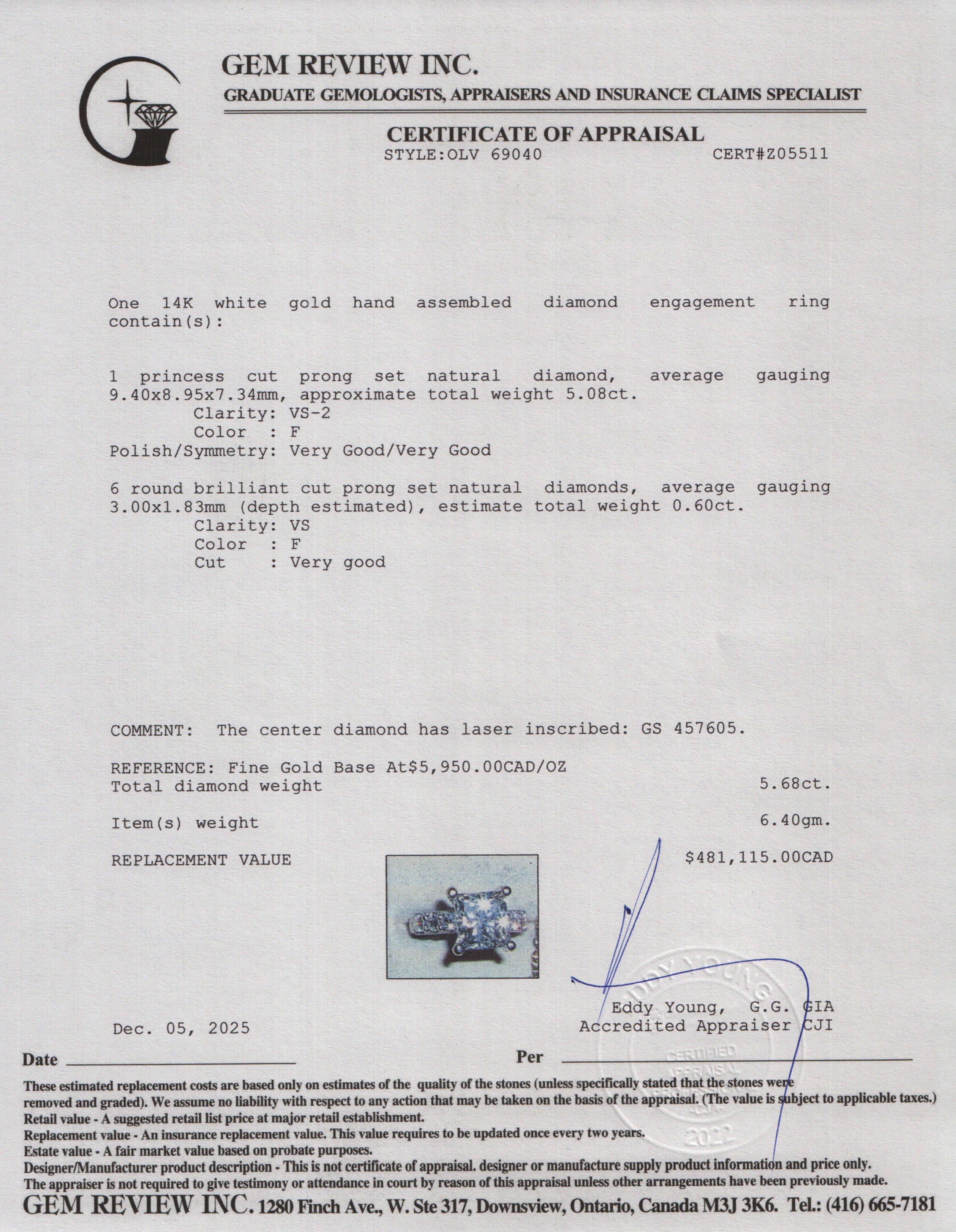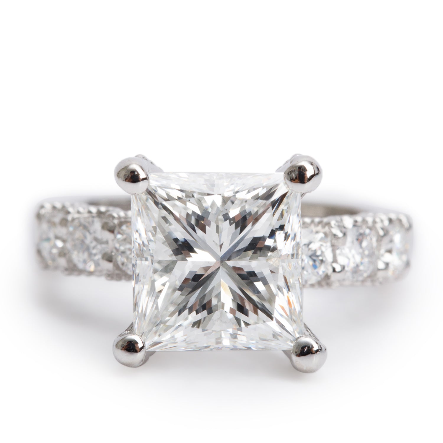14k White Gold 5.08 ct. Princess Cut Diamond Engagement Ring, Size 6.25
