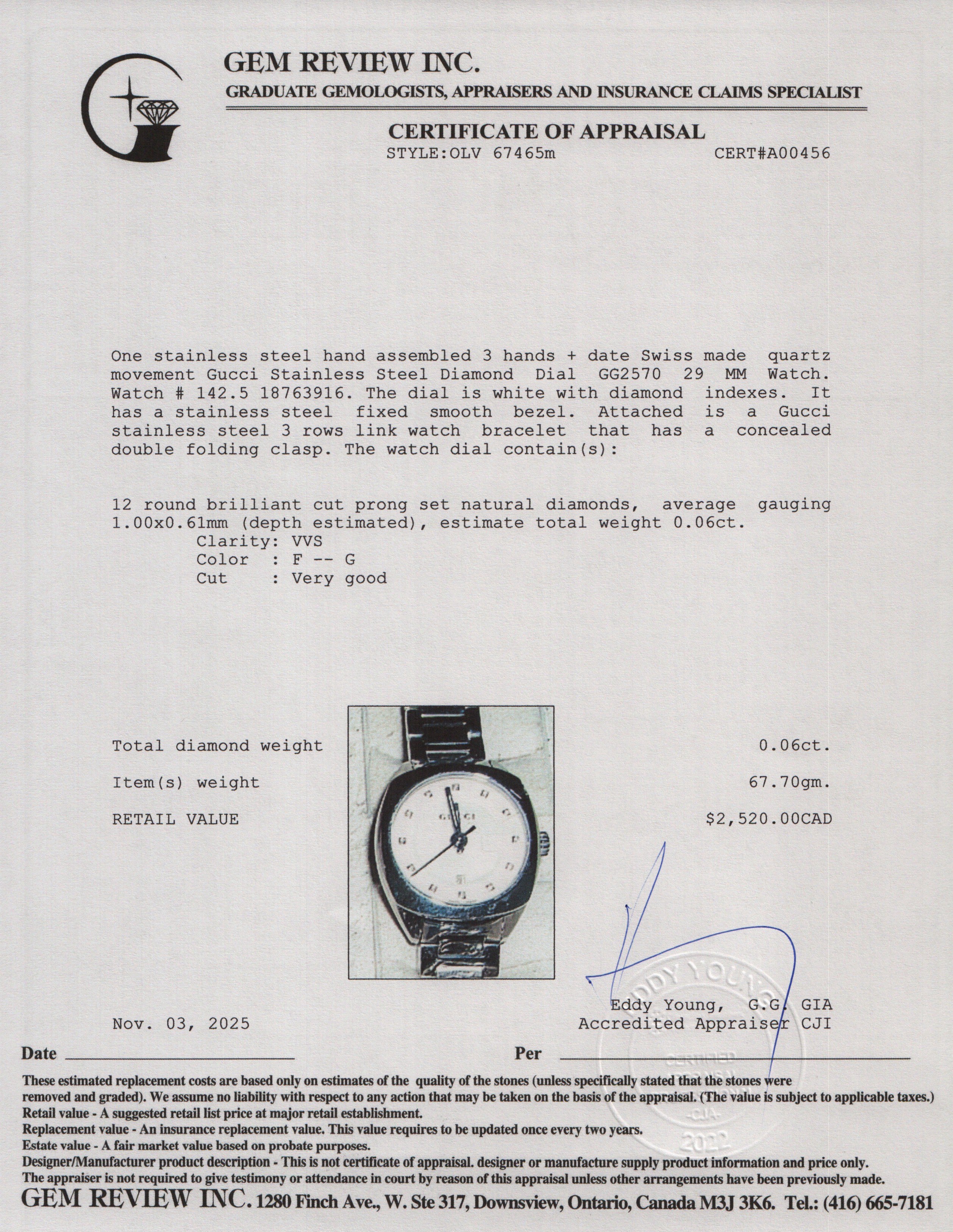 Stainless Steel GG2570 29 MM Quartz Watch White Diamond Dial