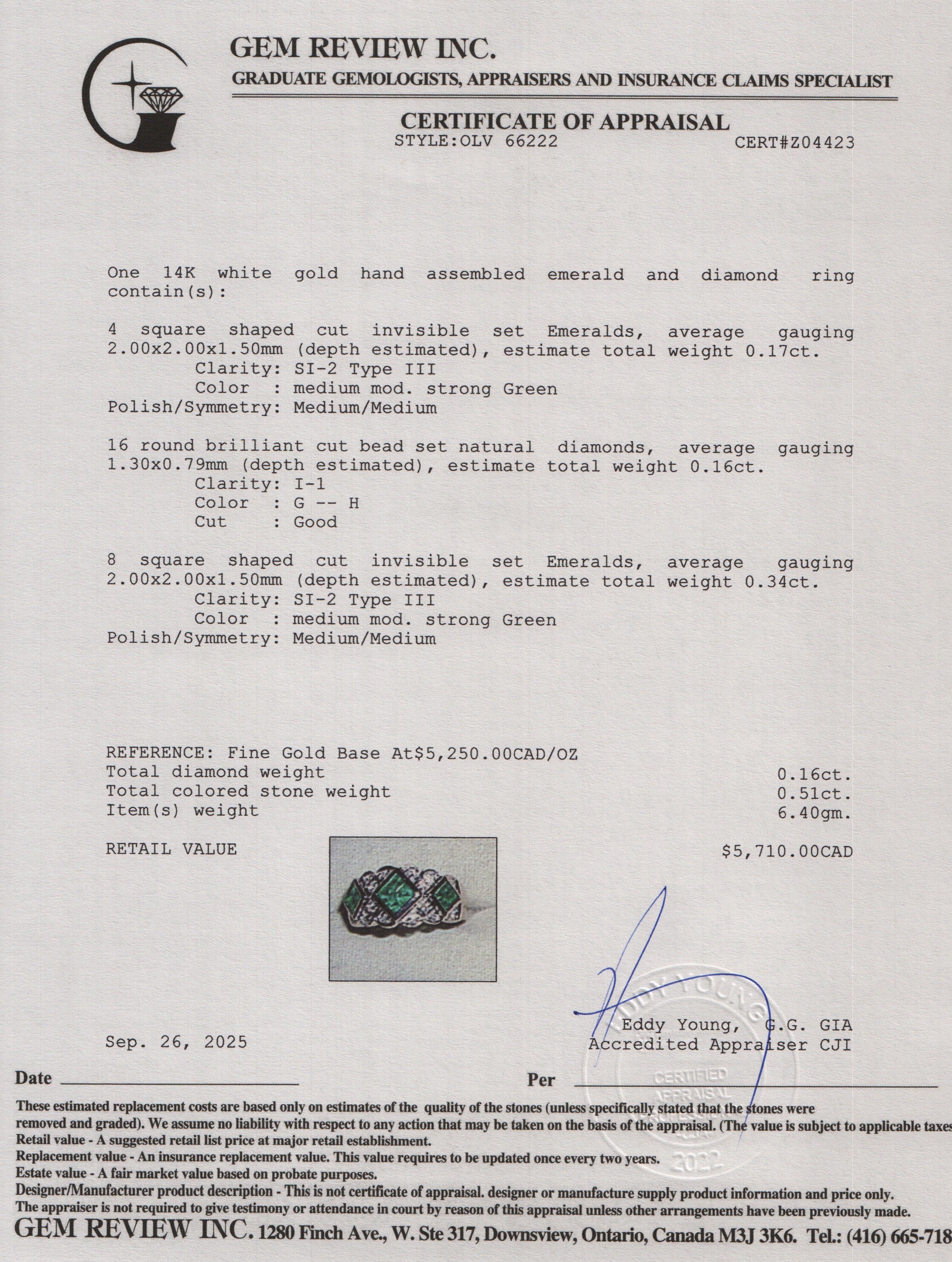 14k White Gold Emerald & Diamond Ring, Size 7.25