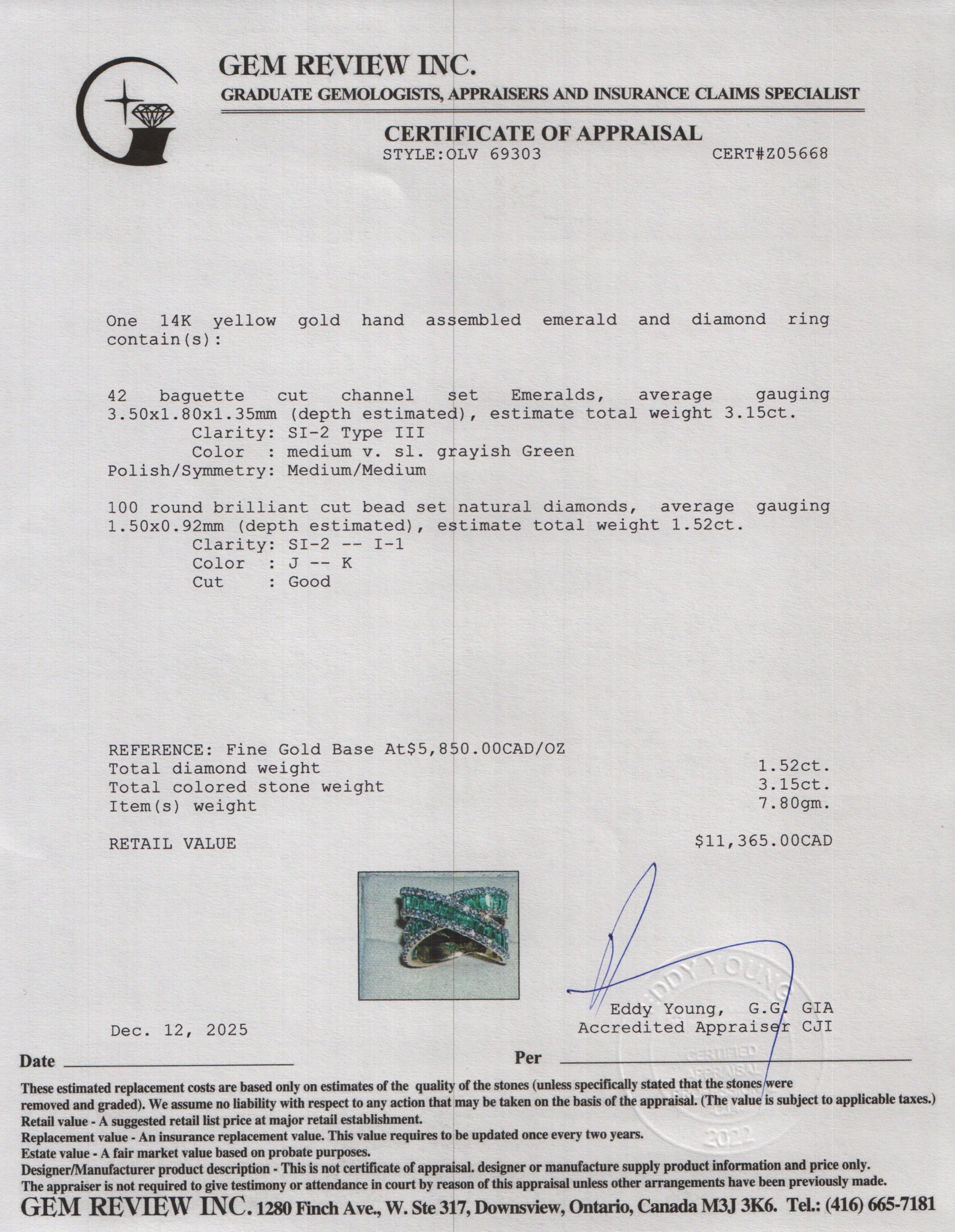 14k Yellow Gold Emerald & Diamond Crossover Ring, Size 6.75