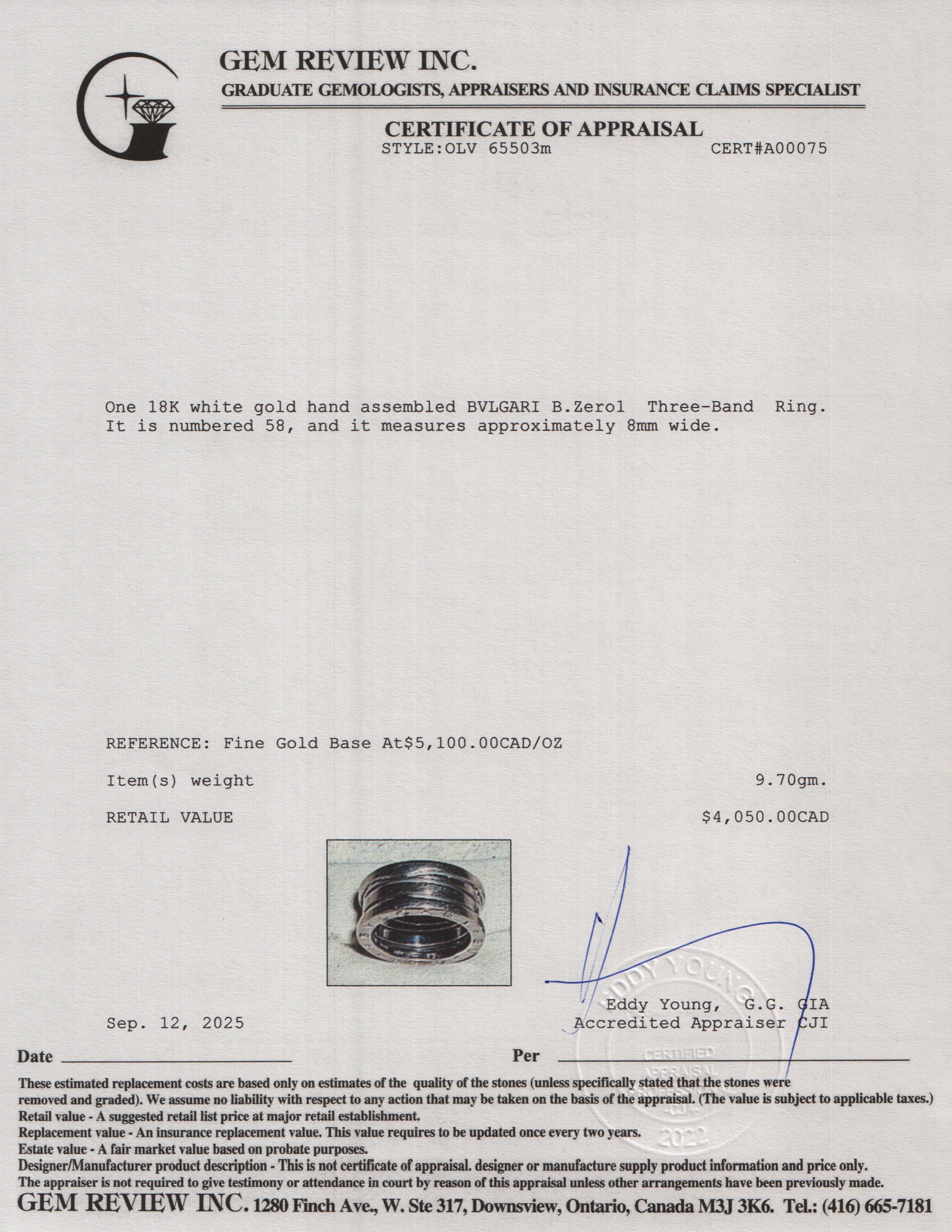 BVLGARI 18k White Gold B.Zero1 Three-Band Ring, Size 58 8.5