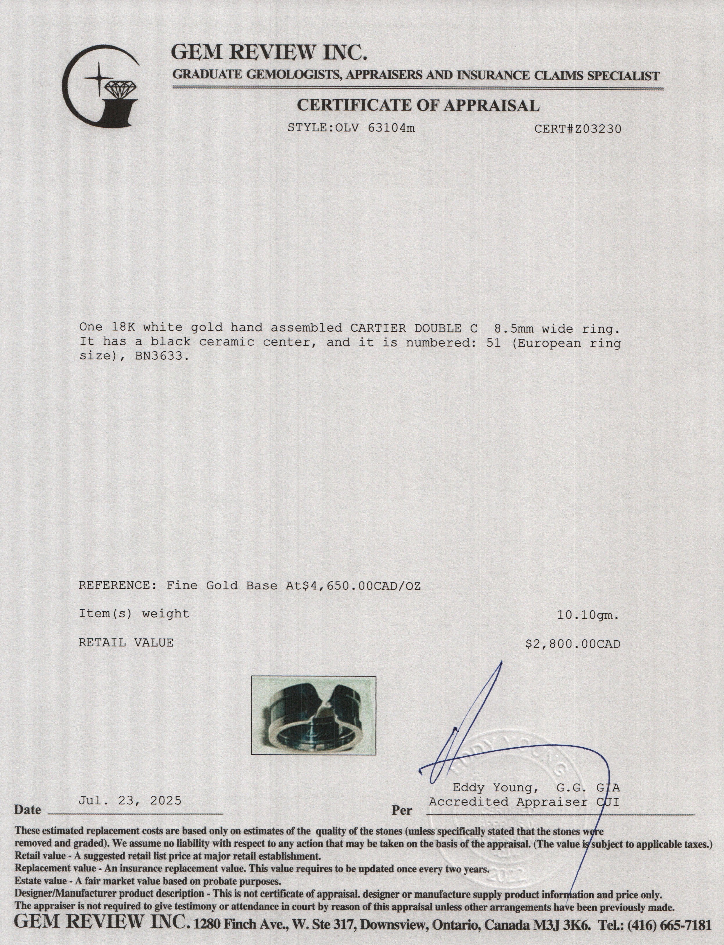 18k White Gold & Black Ceramic Double C Ring, Size 51 6.75
