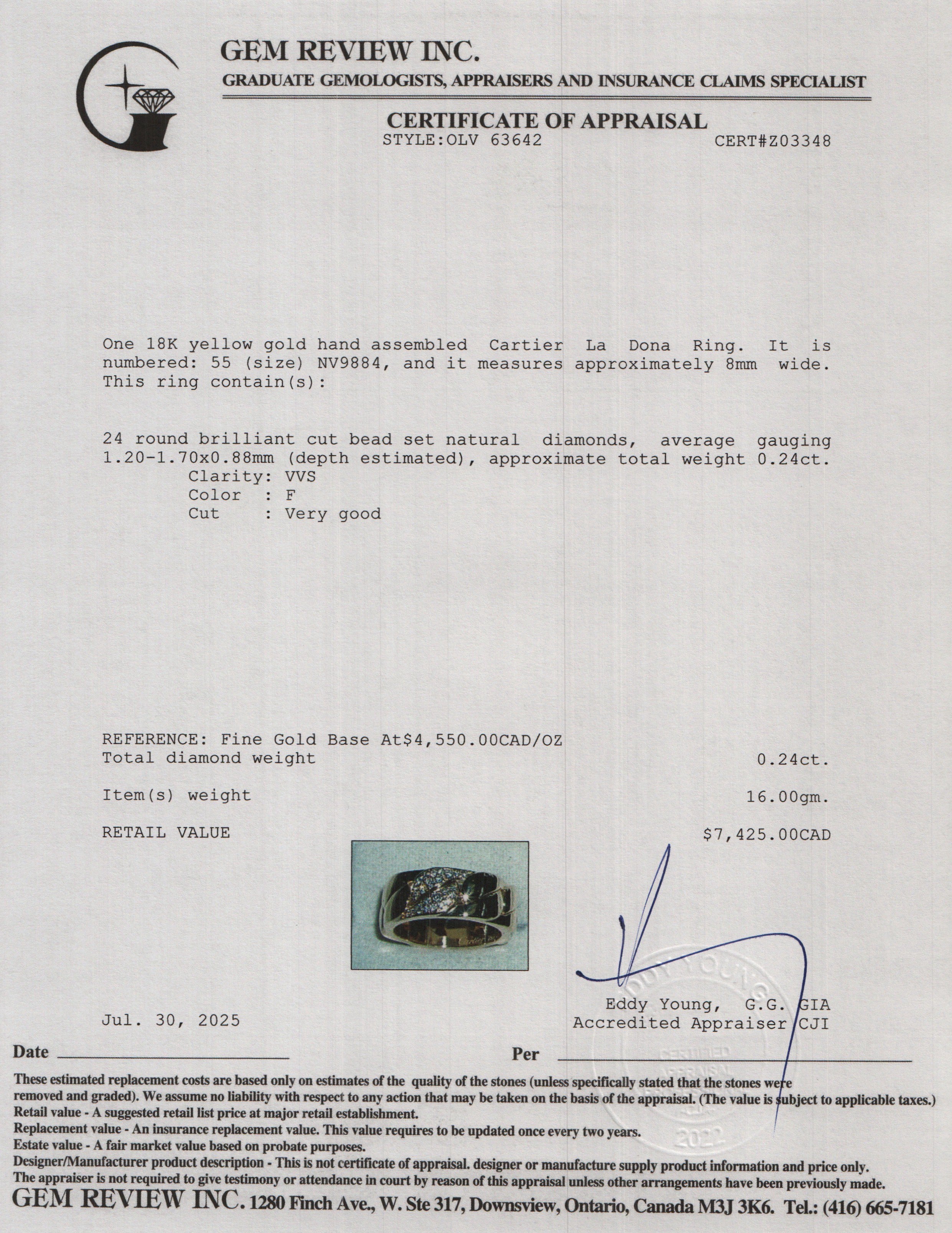 18k Yellow Gold Diamond La Dona Ring, Size 55 7.25