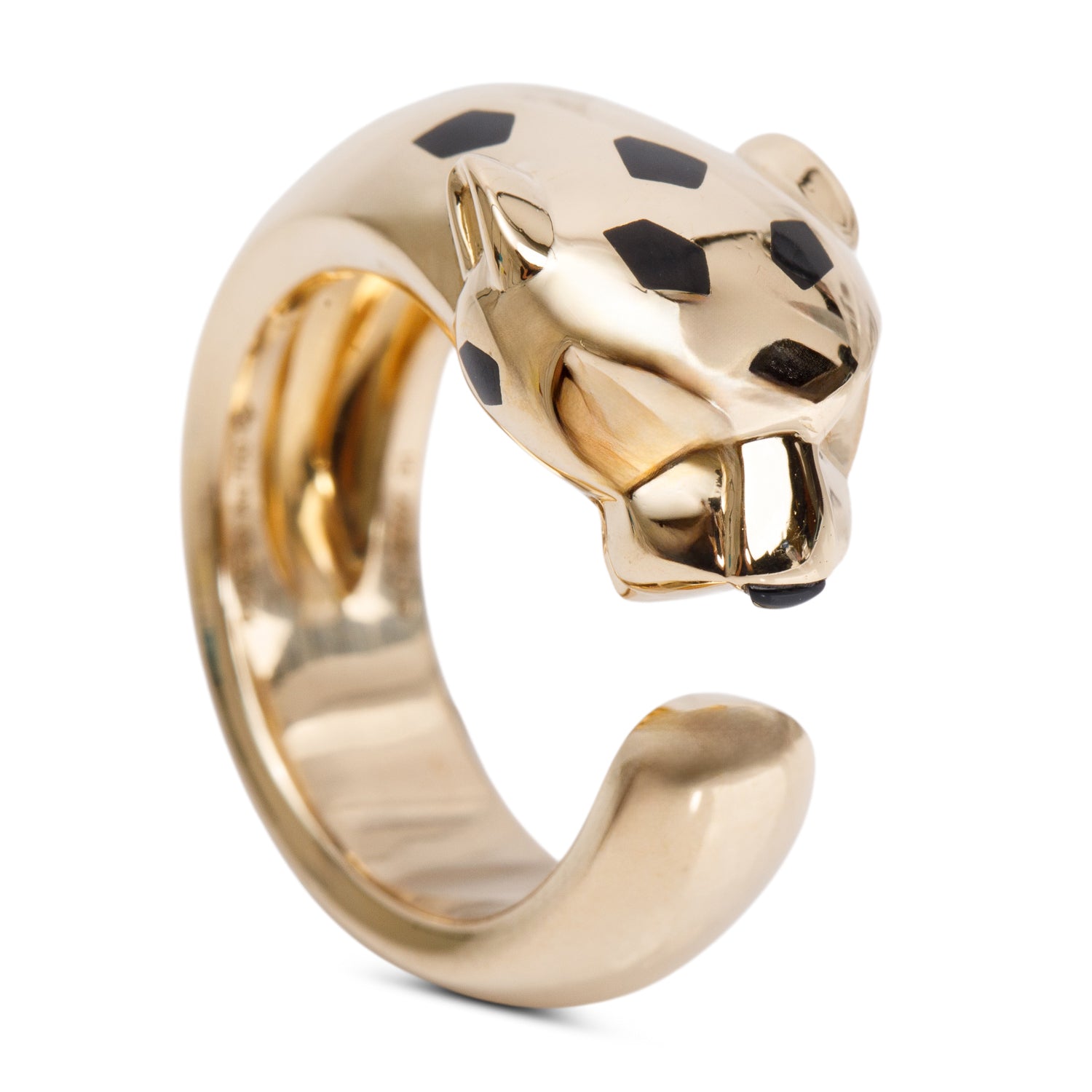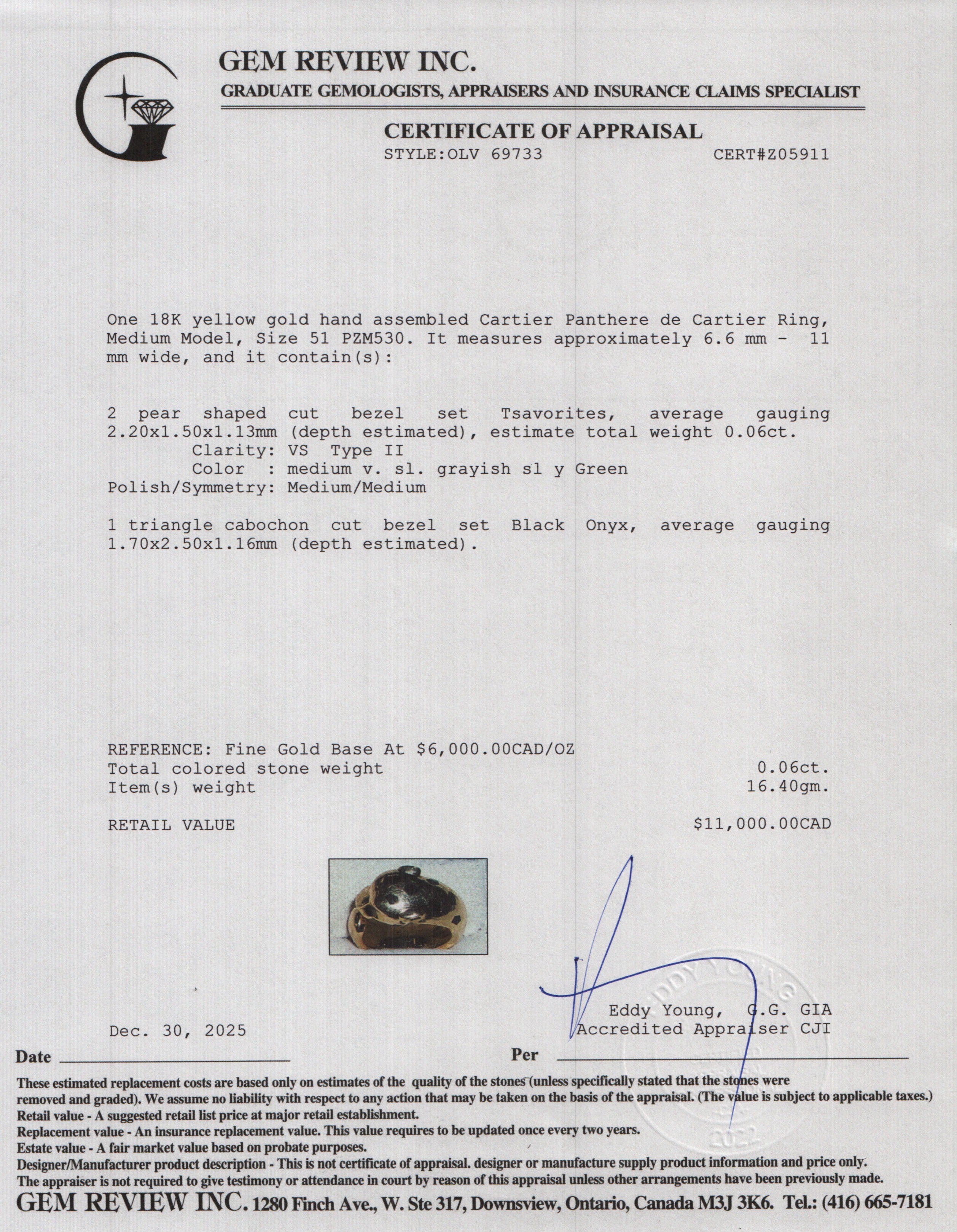 2022 18k Yellow Gold Onyx & Tsavorite Panthere de Ring, Medium Model, Size 51 5.5 w/ Box Receipt & Certificate