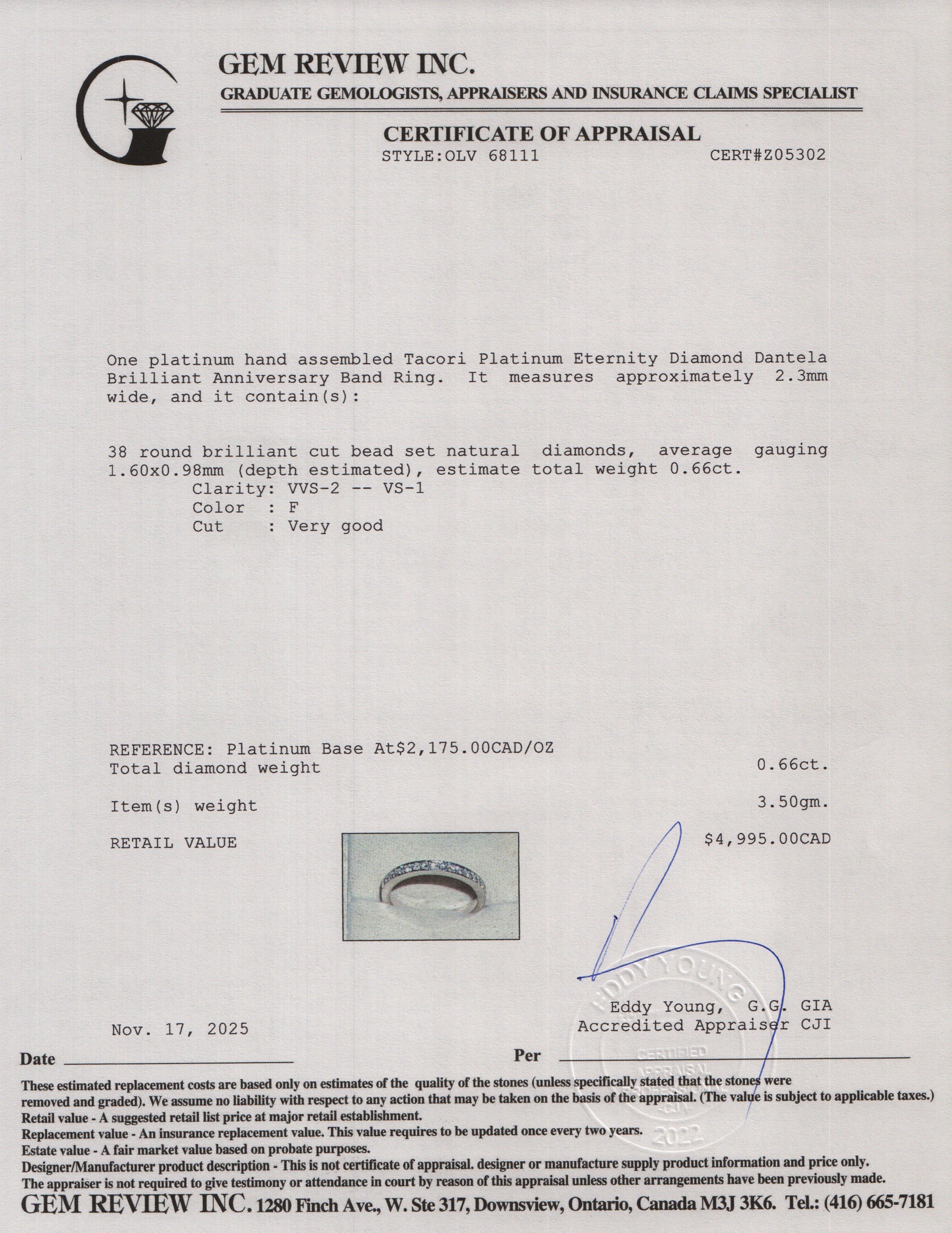 Tacori Platinum Eternity Diamond Dantela Brilliant Anniversary Band Ring, Size 6.25