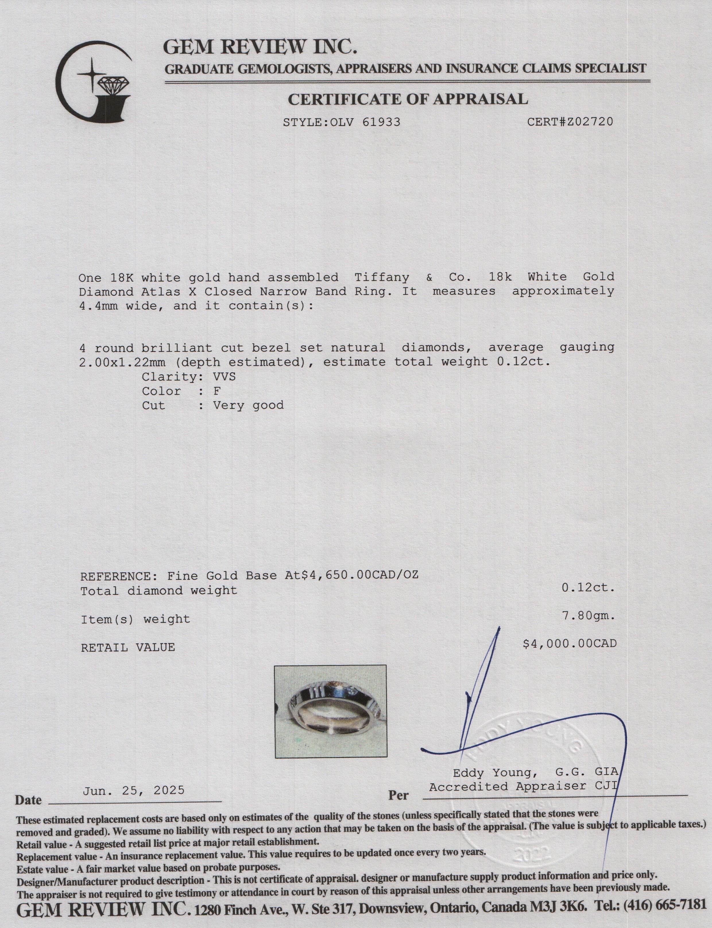 18k White Gold Diamond Atlas X Closed Narrow Band Ring, Size 6 w/ Box