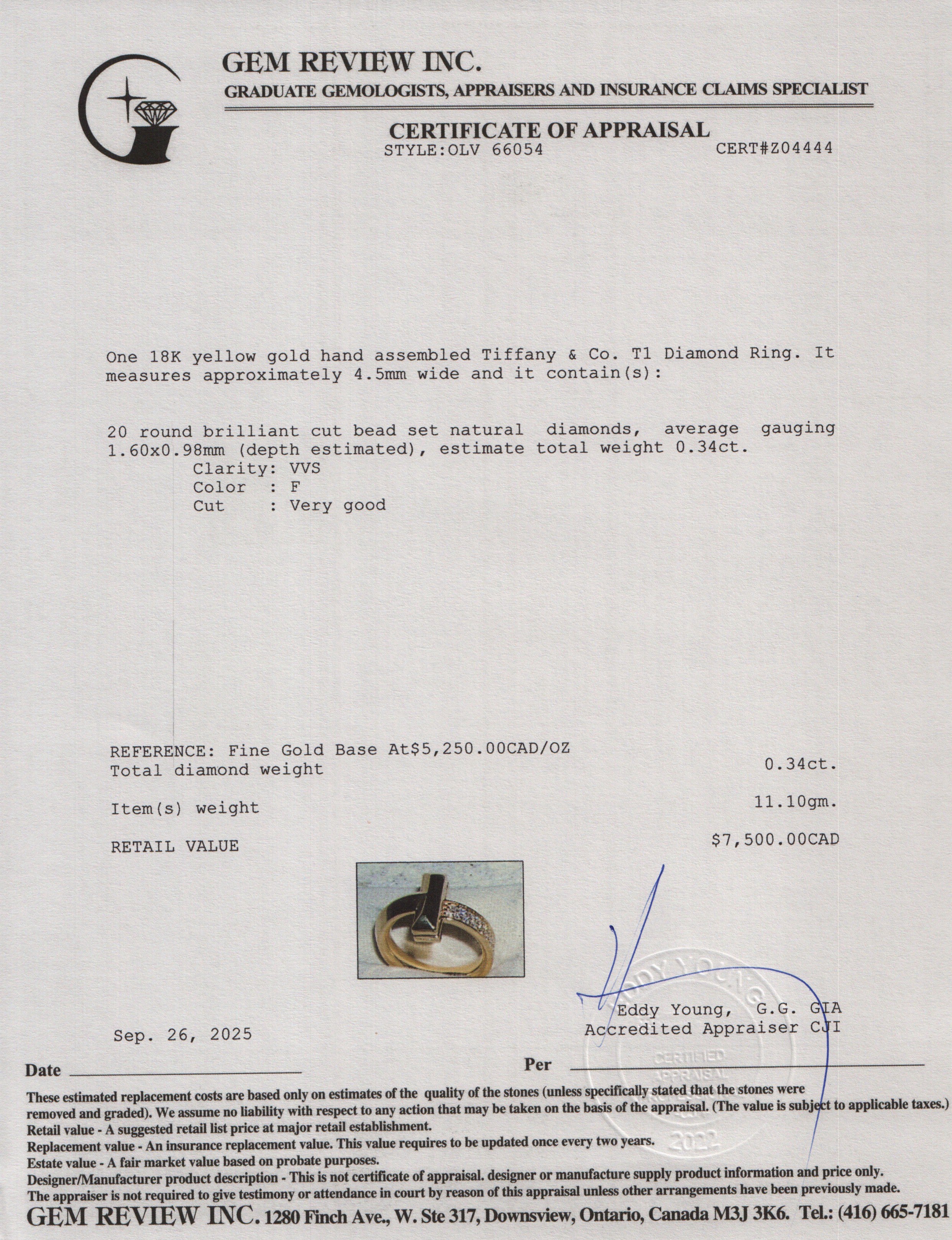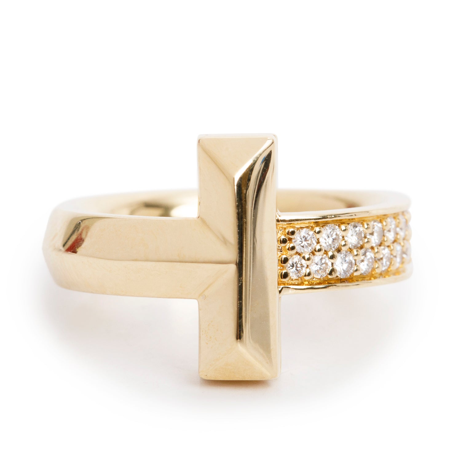 18k Yellow Gold T1 Diamond Ring, Size 5.5 w/ Box & Receipt