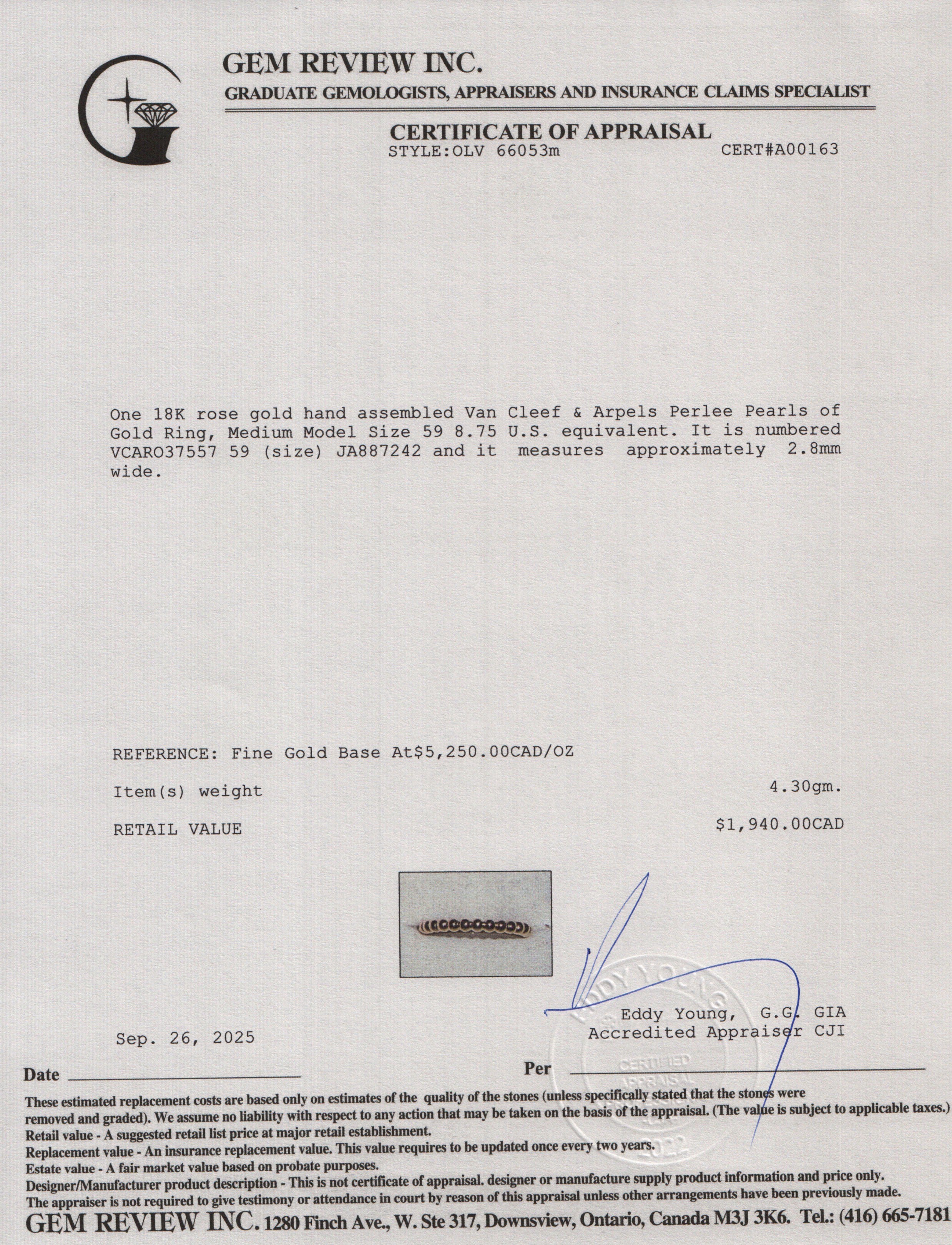 18k Rose Gold Perlee Pearls of Gold Ring, Medium Model Size 59 8.75 w/ Certificate & Carry Pouch