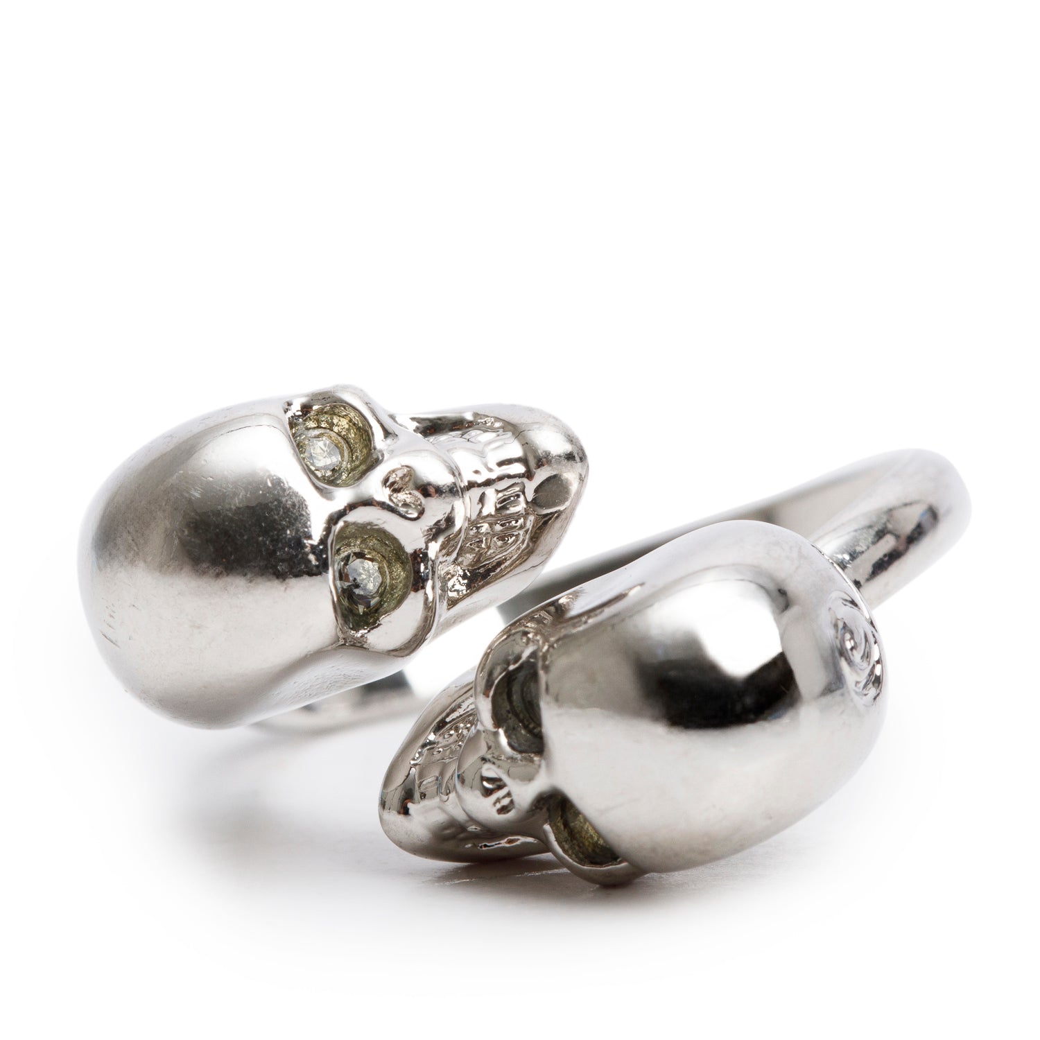 Silver Plated Crystal Twin Skull Ring, Size 7.5