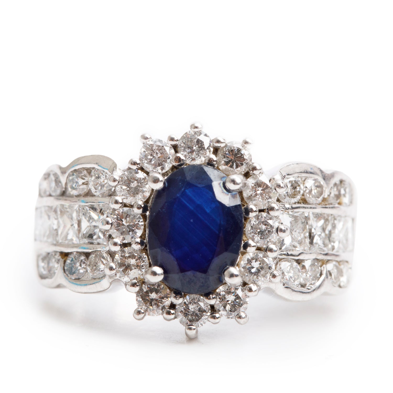 14k White Gold Blue Sapphire & Diamond Ring, Size 7