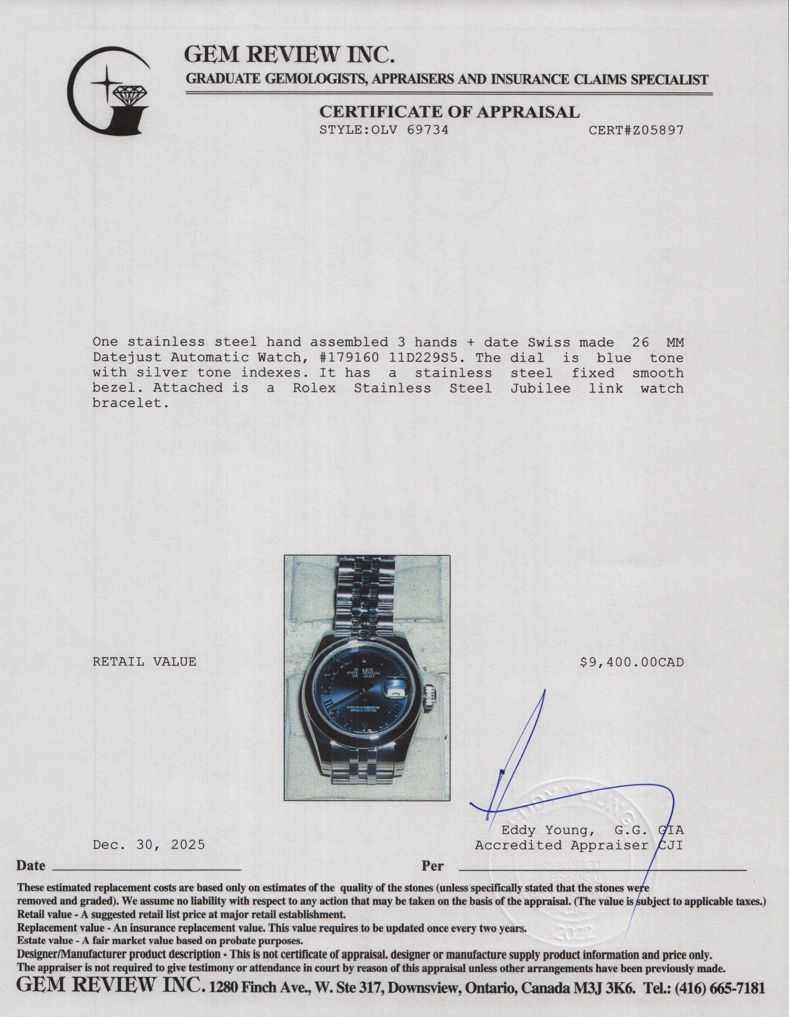 Stainless Steel 26 MM Lady-Datejust Automatic Watch Blue Dial 179160 w/ Box & Papers