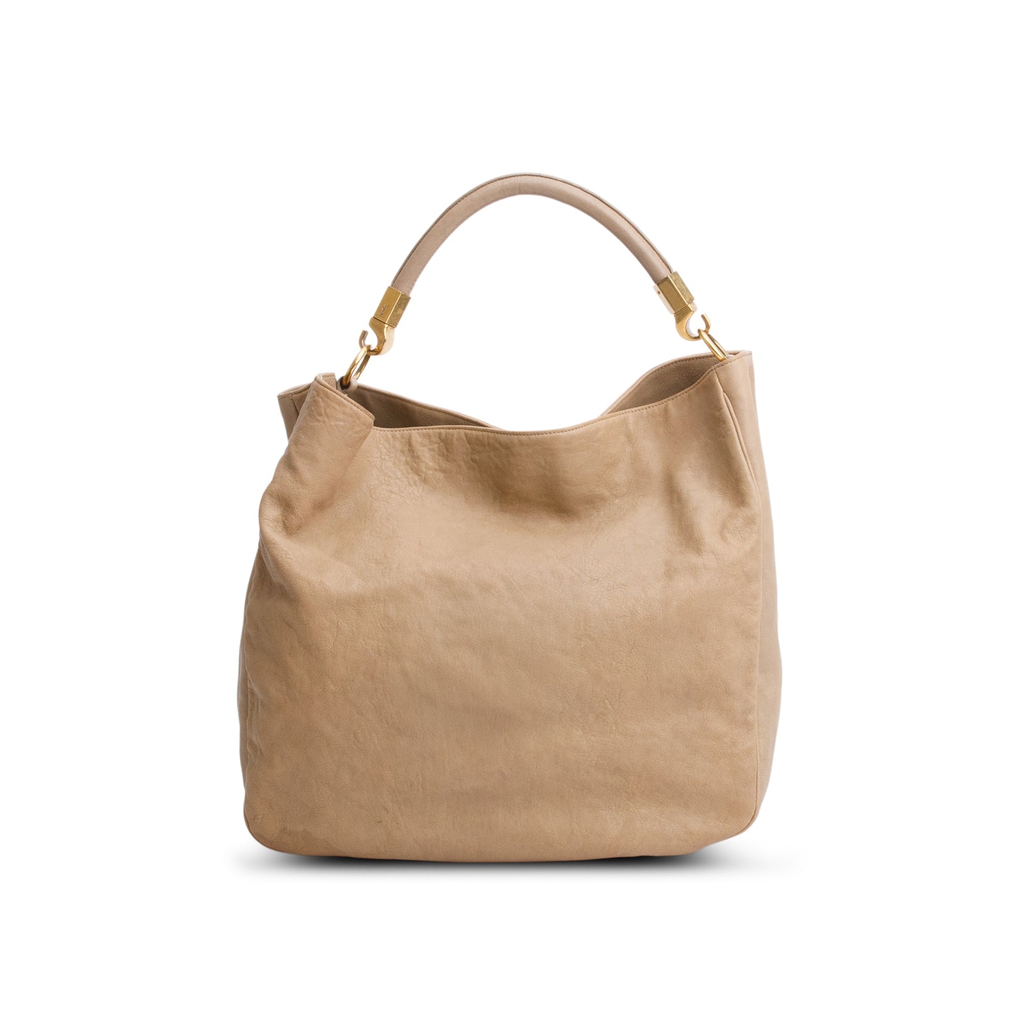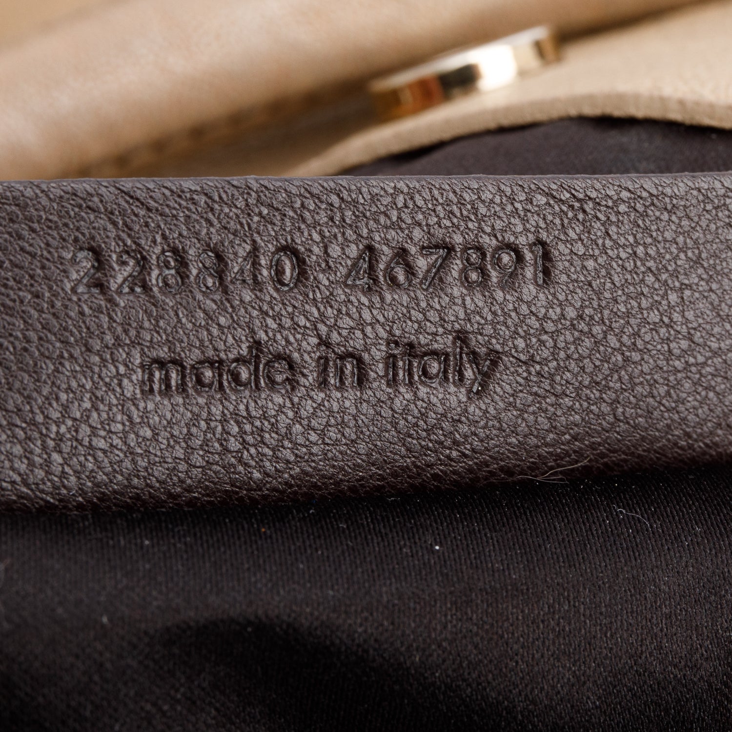 Condition: Good; moderate discoloration and creasing at exterior leather and handle; slight scuffing at exterior corners; slight tarnishing and scratches at hardware.