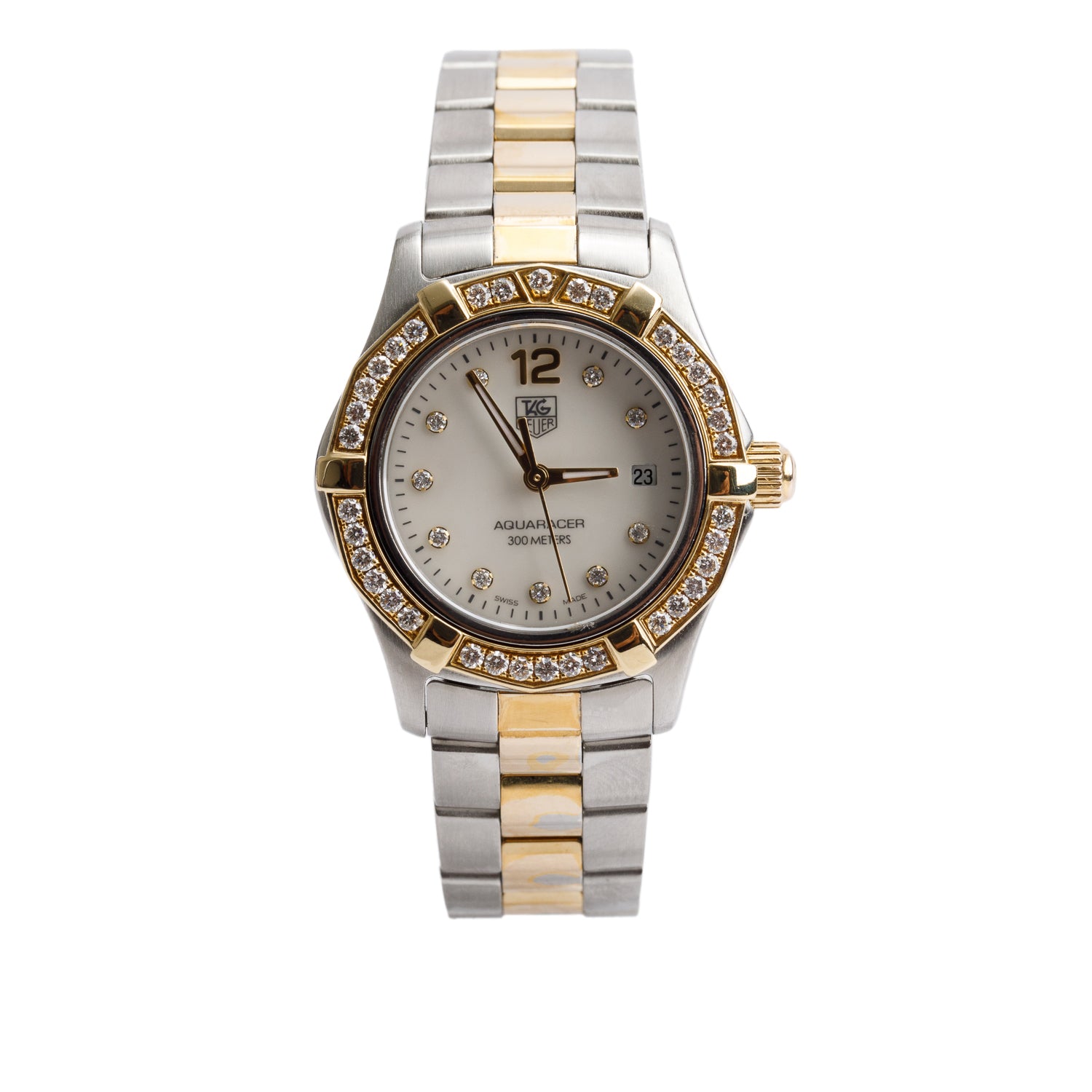 Stainless Steel & Yellow Gold Plated Diamond Bezel Aquaracer 27 MM Quartz Watch Diamond Mother of Pearl Dial WAF1450