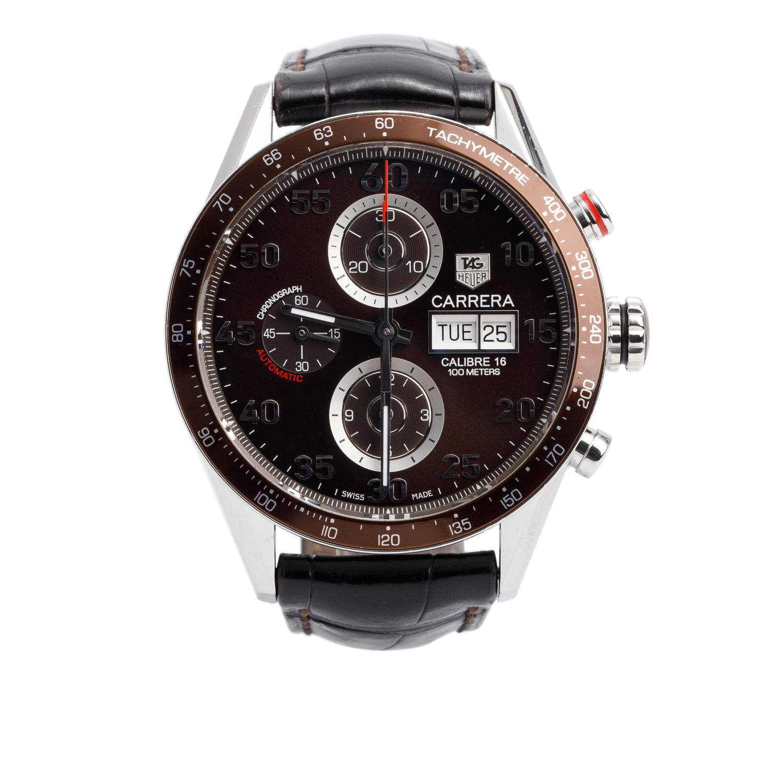 Stainless Steel Carrera 43 MM Automatic Chronograph Watch Brown Dial CV2A12 w/ Box & Papers