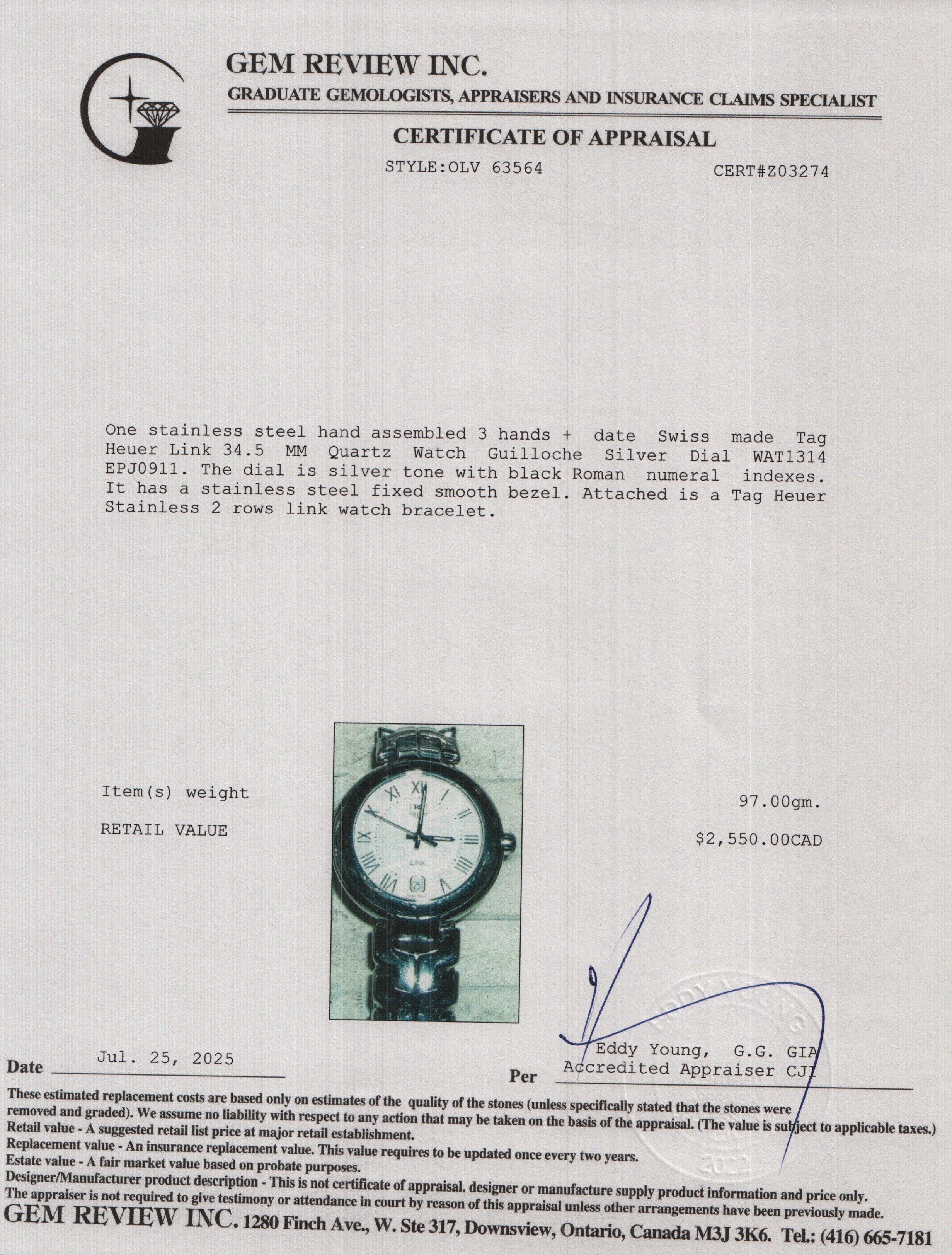 Stainless Steel Link 34.5 MM Quartz Watch Guilloche Silver Dial WAT1314 w/ Box