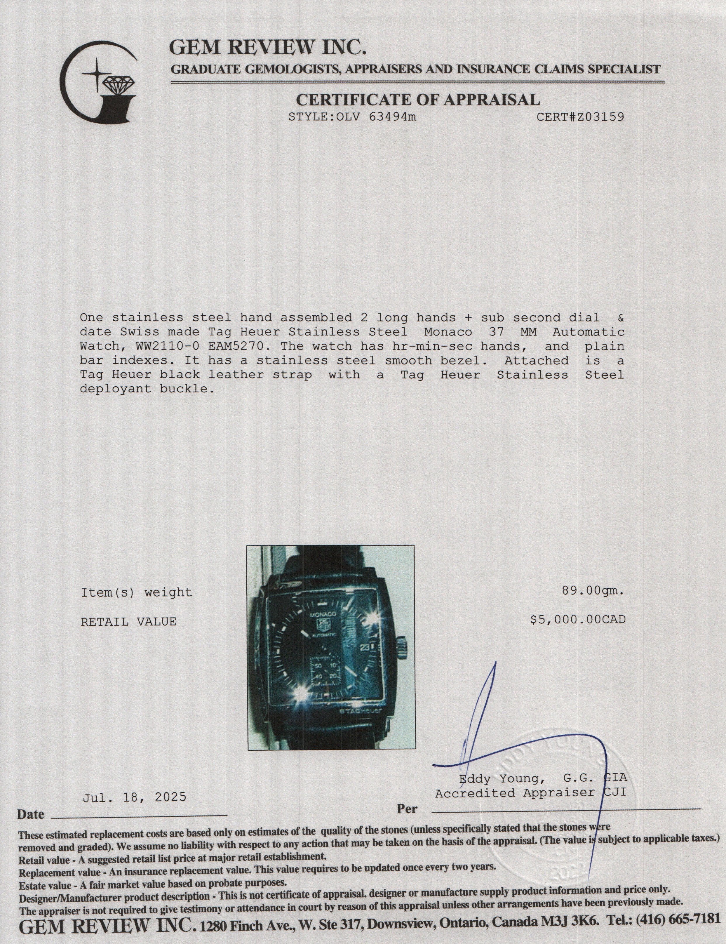 Stainless Steel Monaco 37 MM Automatic Watch WW2110-0 w/ Box & Papers