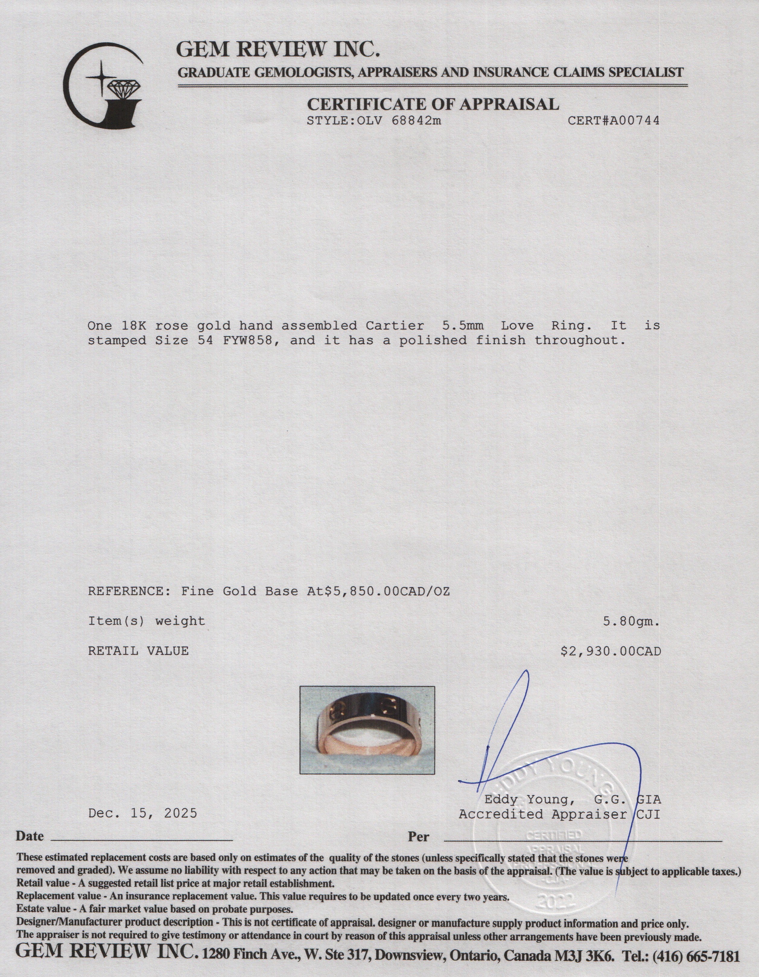 2025 18k Yellow Gold 5.5 MM Love Ring, Classic Model, Size 52 6 w/ Box & Certificate