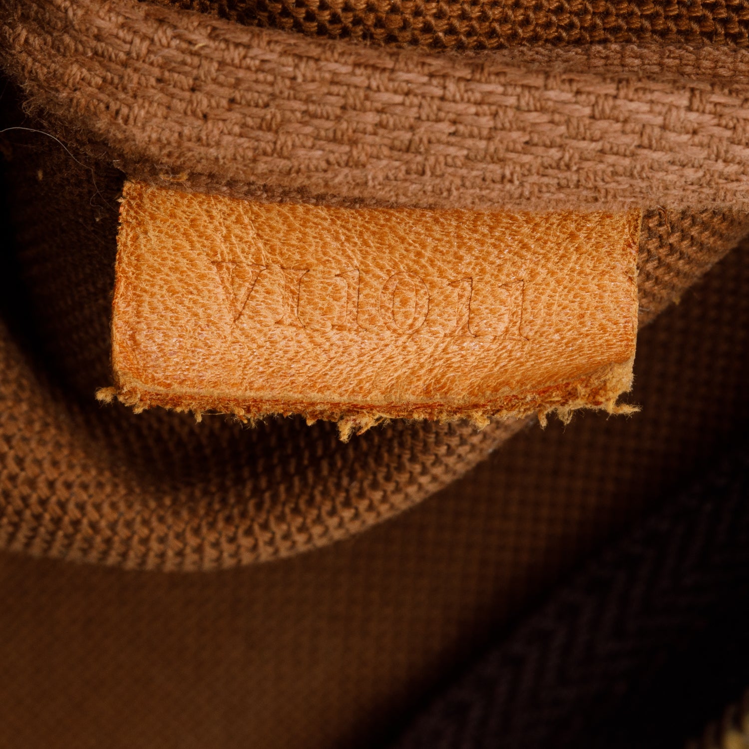 Condition: Good; moderate wear and discoloration at vachetta tab and strap; minor marks at exterior canvas and interior; some scratches and tarnishing at hardware.