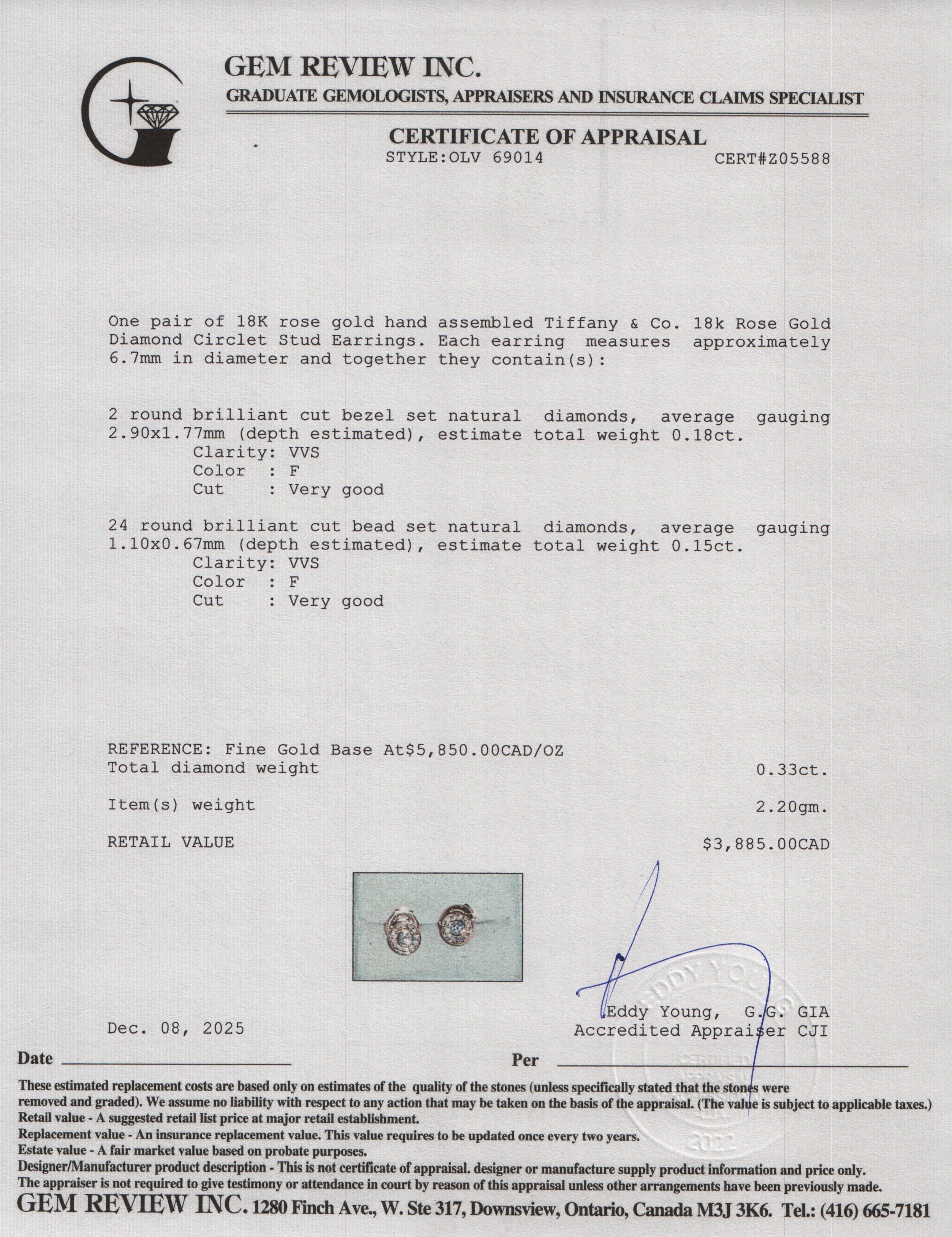 18k Rose Gold Diamond Circlet Stud Earrings w/ Box