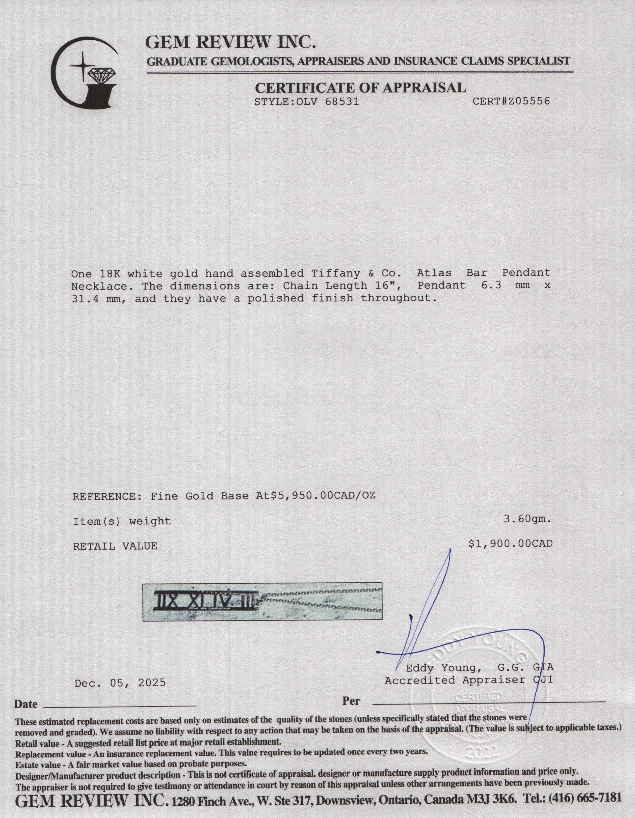 18k White Gold Atlas Bar Pendant Necklace w/ Box