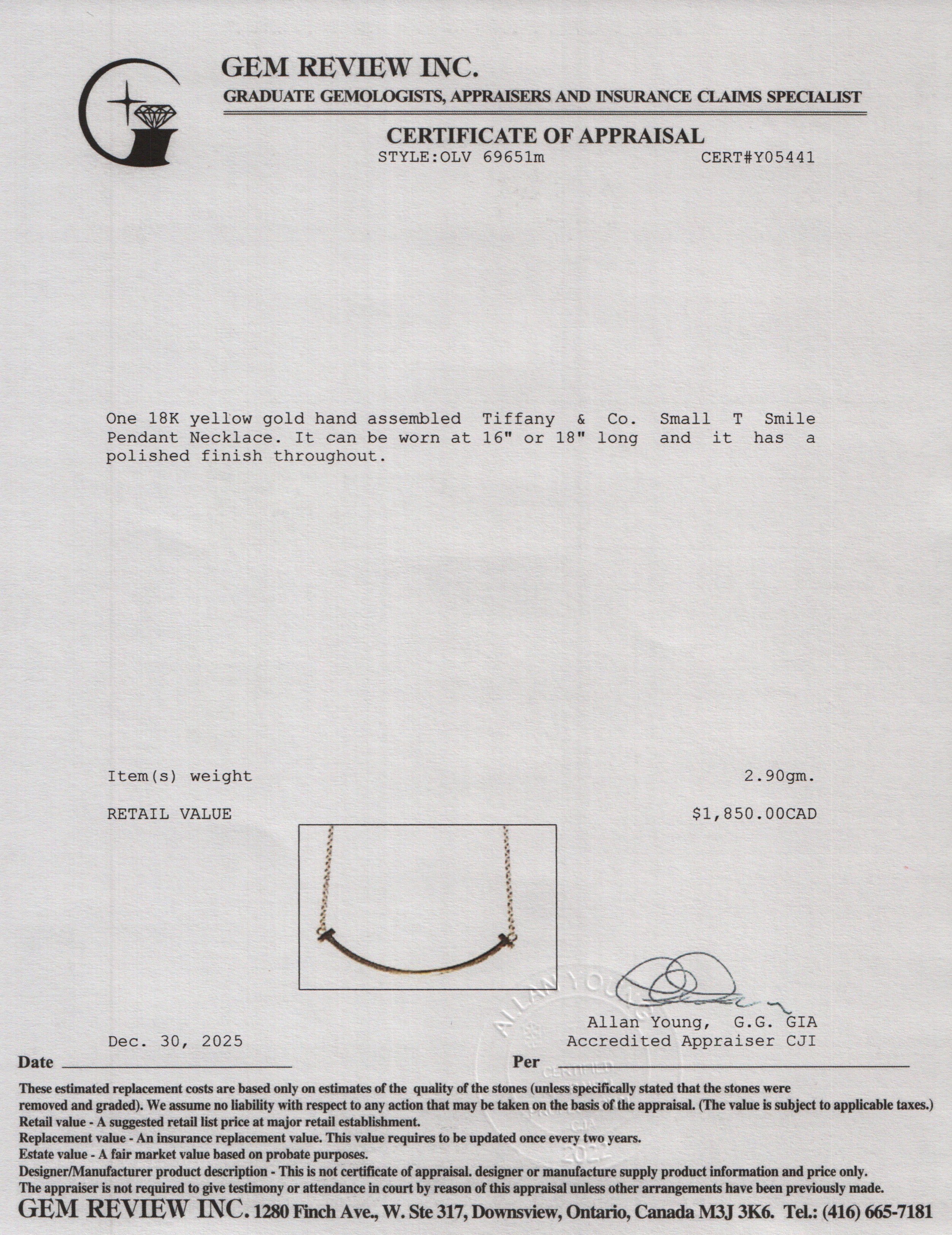 18k Yellow Gold Small T Smile Pendant Necklace w/ Box