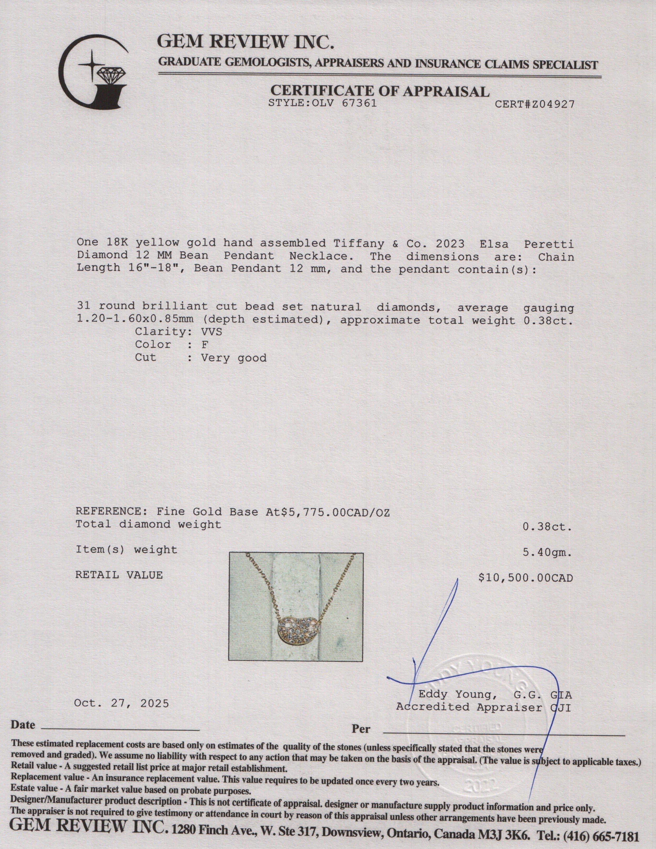 2023 Elsa Peretti 18k Yellow Gold Diamond 12 MM Bean Pendant Necklace w/ Box & Receipt