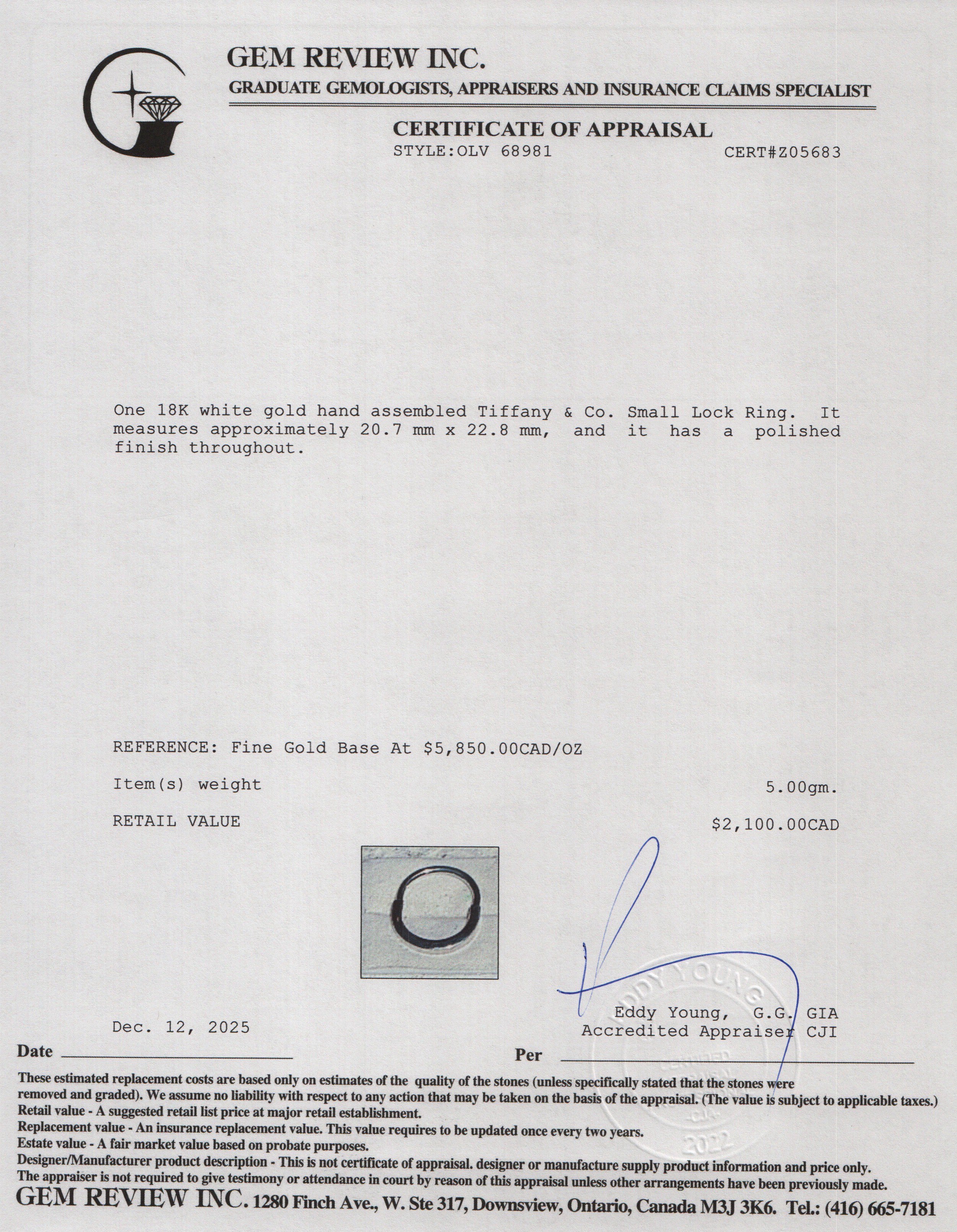 2025 18k White Gold Lock Ring, Size 6.5 w/ Box & Receipt
