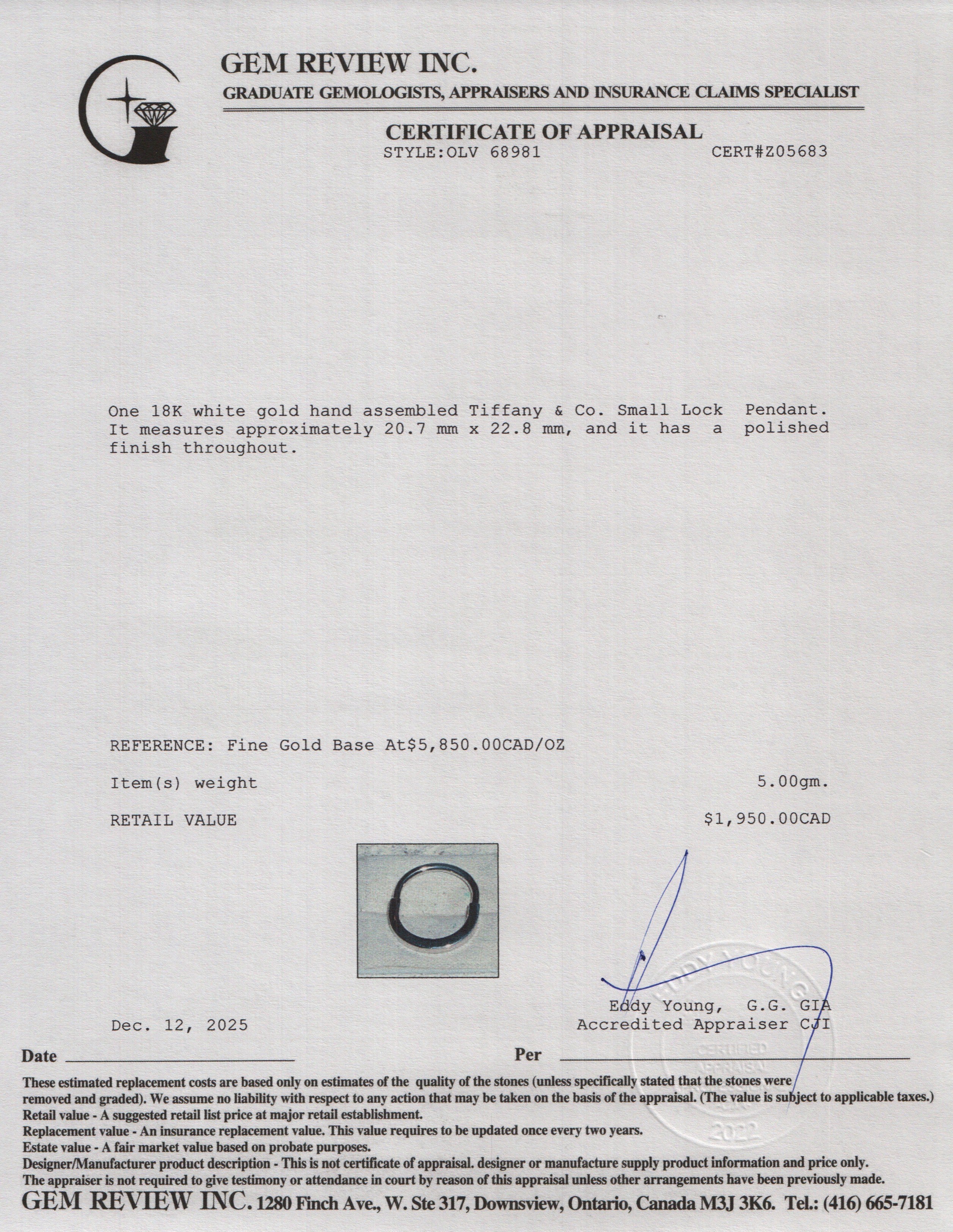 2025 18k White Gold Small Lock Pendant w/ Box & Receipt