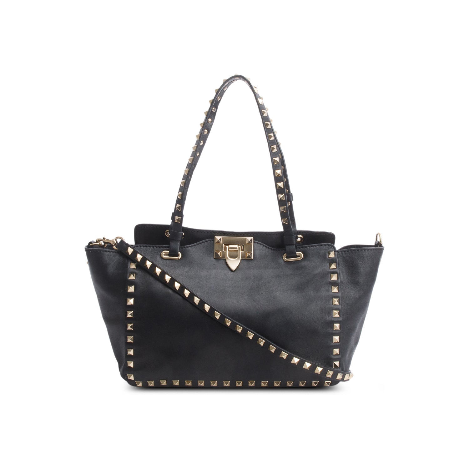 Black Calfskin Leather Small Rockstud Tote Bag w/ Strap