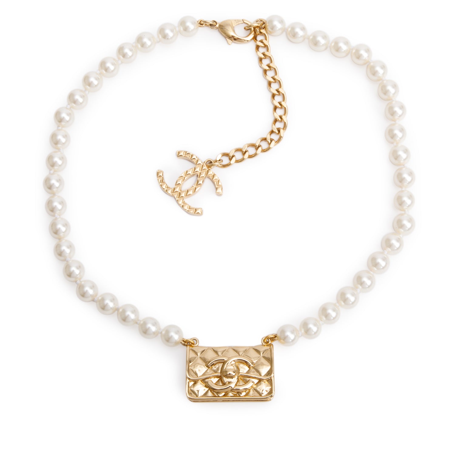 2019 Gold-Plated Faux Pearl, Enamel & Strass 'CHANEL' Charm Necklace