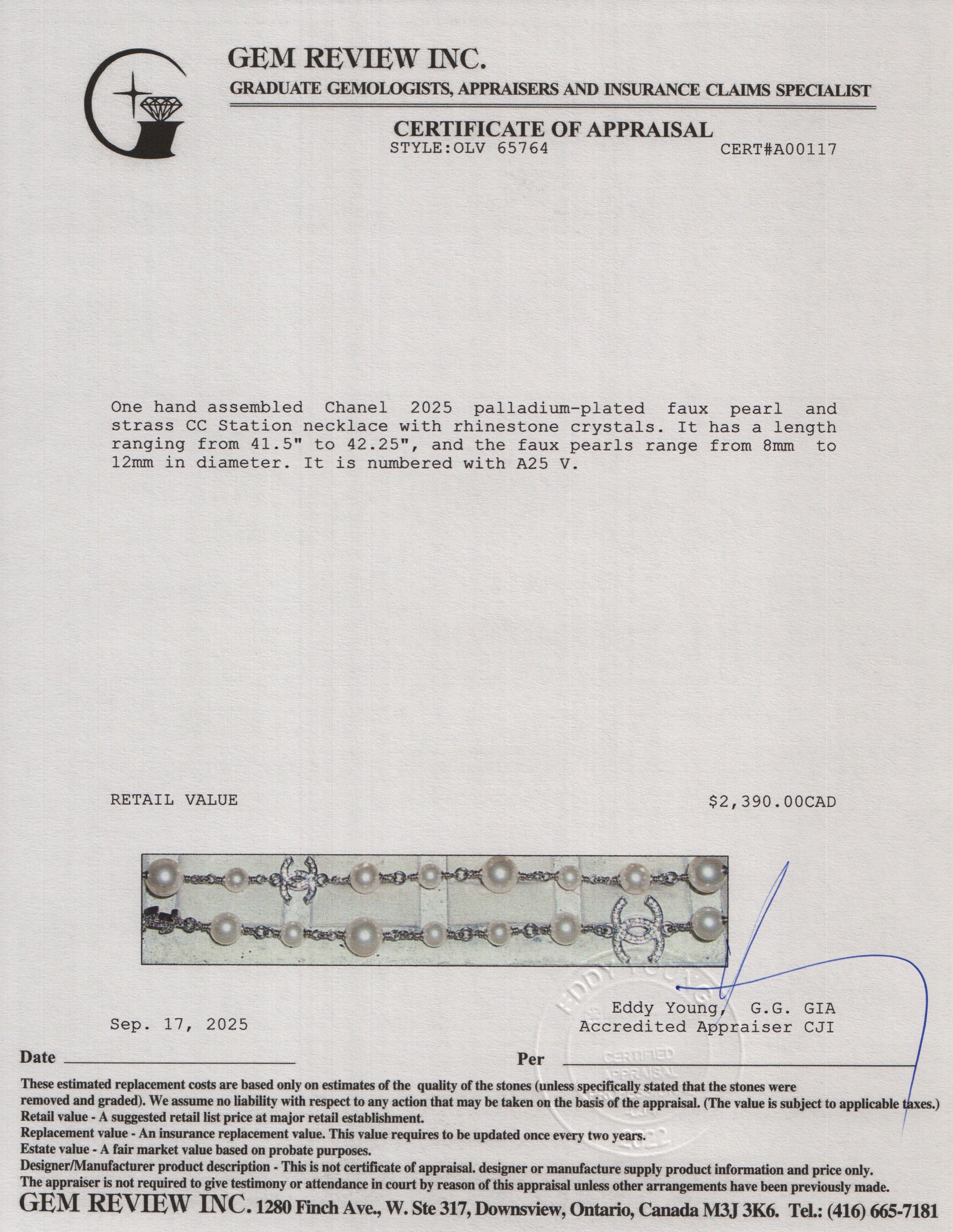 2020 Palladium-Plated Faux Pearl & Strass CC Pendant Necklace w/ Box